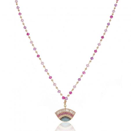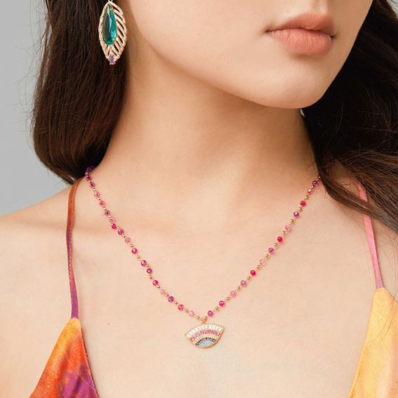 Deze verrukkelijke ketting is ontworpen om uw halslijn met unieke elegantie te verfraaien. Het is gemonteerd aan een middellange rozenkransketting en heeft een waaiervormige hanger, die een beschermend oog oproept. Versierd met gekleurde strass-steentjes in paars, roze, fuchsia en turkooisblauw diamanteffect, wordt dit sieraad versterkt door strasssteentjes met baguette-diamanteffect, waardoor het wimpereffect wordt versterkt. Perfect om een vleugje glamour en mysterie aan je outfit toe te voegen.