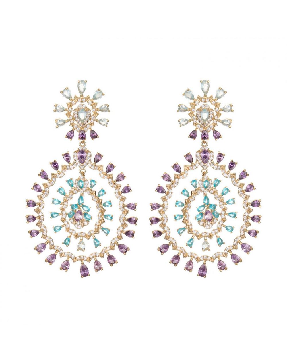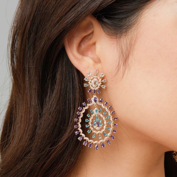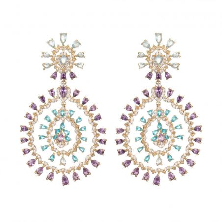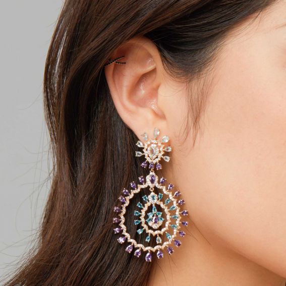 Deze statement-oorbellen trekken de aandacht met hun elegante dubbele hoepelontwerp en een op kanten bloemen geïnspireerde oorbelkop. Versierd met lichtblauwe strasssteentjes met aquamarijneffect en paarse amethisteffect, en bezaaid met kristallen met diamanteffect voor maximale schittering. Deze barokke oorbellen zijn perfect voor wie een krachtig statement wil maken en voegen een dramatische, ongeremde toets toe aan je zomeroutfits.