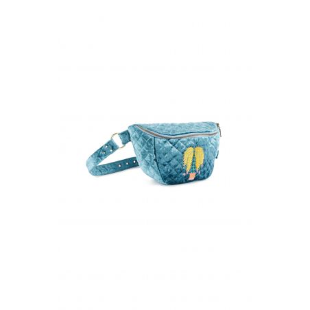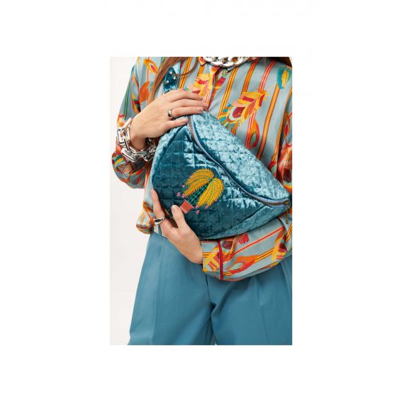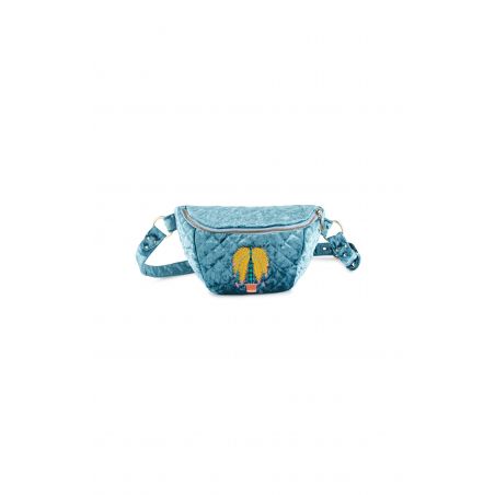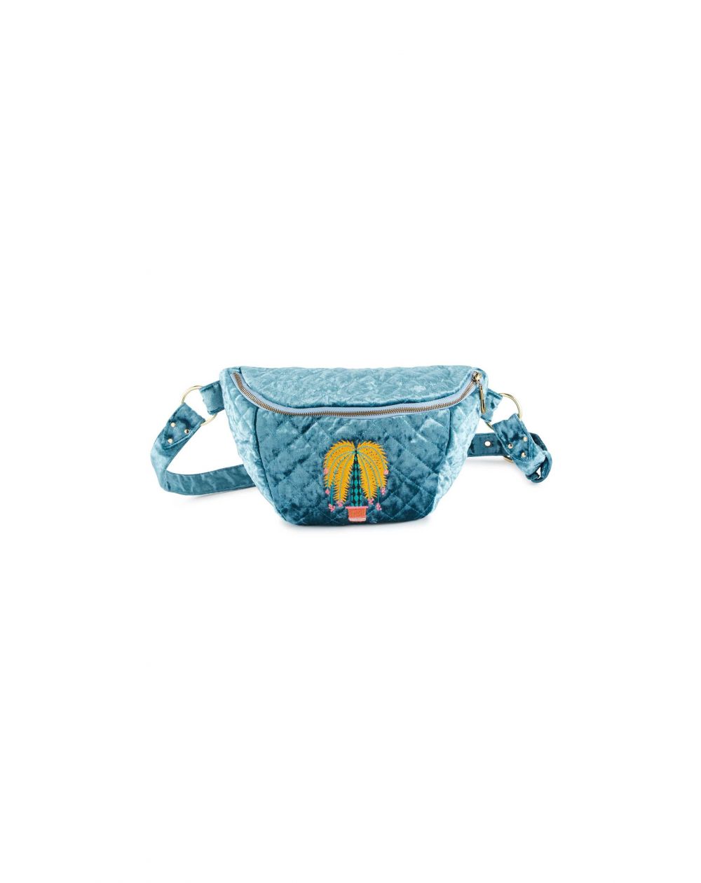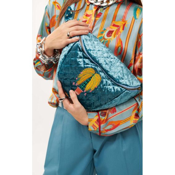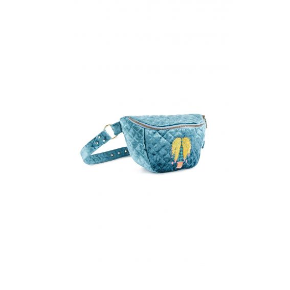Groen gewatteerd fluwelen heuptasje, versierd met een geborduurde palmboom in de kleuren geel, turkoois, roze en baksteen. Met zijn contrasterende gele rits voor een pop-touch.