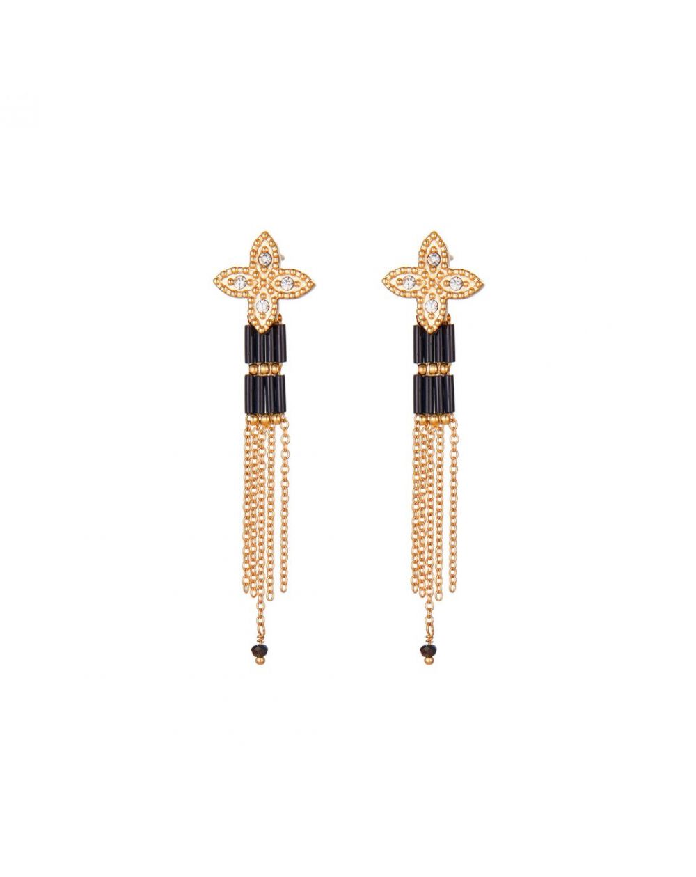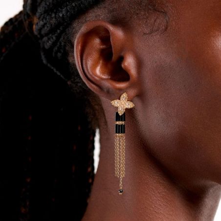 Deze oorbellen fascineren ons door hun langwerpige klavervormige kop, fijn versierd met strass-steentjes, die doen denken aan oude overblijfselen uit een kathedraal. De delicate kettingen die eraan ontsnappen, versierd met zwarte buisvormige Miyuki-parels en fijne vergulde parels, voegen een vleugje vrouwelijk, krachtig en verfijnd toe. Hun lengte accentueert op sierlijke wijze een heldere hals, wat een onvergelijkbare elegantie oplevert.