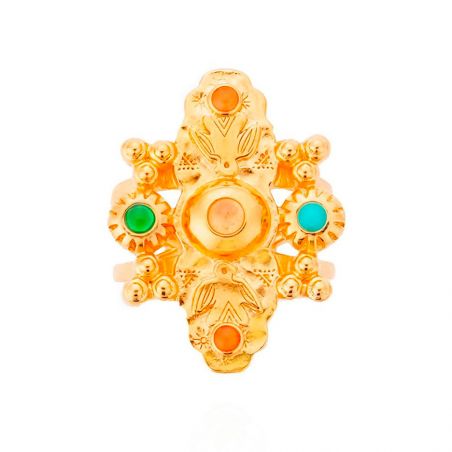 Deze 14-karaats gouden ring, versterkt door een dubbele hoepel, belichaamt gedurfde elegantie. Imposant en verfijnd, het verleidt met de precisie van zijn details en de energie van het centrale motief, dat doet denken aan een Sioux-totem. Twee majestueuze dondervogels omlijsten een imposante koepel, terwijl geëmailleerde cabochons in diepe tinten oker, roest, turkoois en granaat het geheel verrijken. Dit sieraad is een ware ode aan de Indiaanse kunst, een sterk sieraad om met trots te dragen.