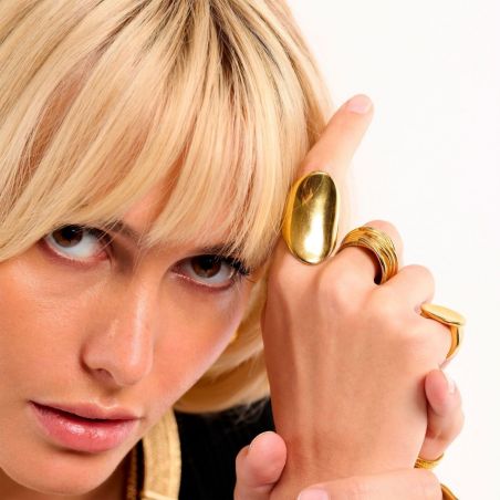 De Nobless -ring is een echte tweede huid van fijn verguld roestvrij staal en omhult de vinger met zijn grote, gladde, gouden oppervlak. Het lange, grafische ovaal doet denken aan de rondingen van een ontwerp, zowel spectaculair als verfijnd. Een tijdloos stuk, het zal snel een van je essentials worden! Verkrijgbaar in twee maten, past op bijna alle vingers.