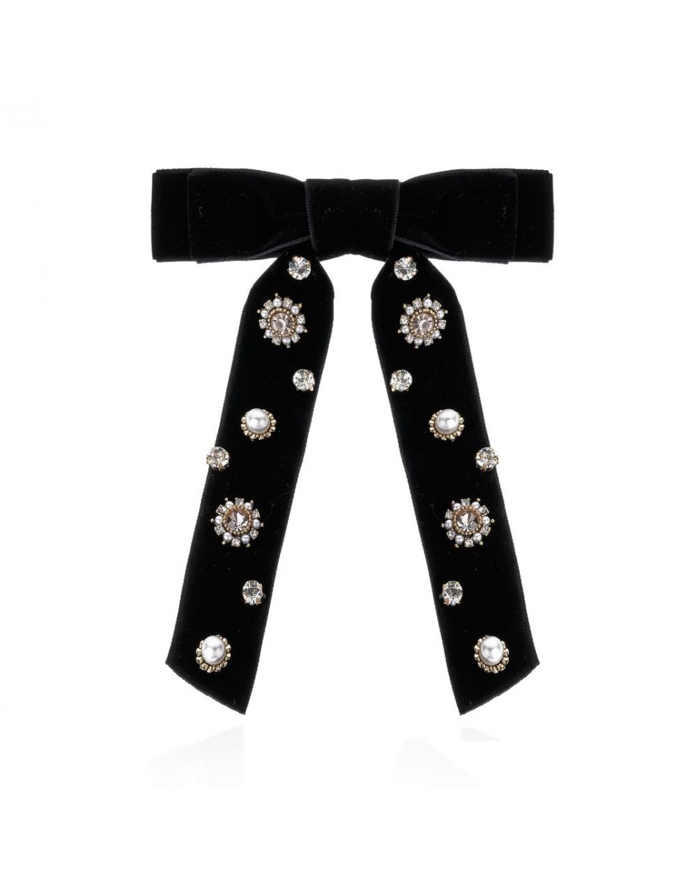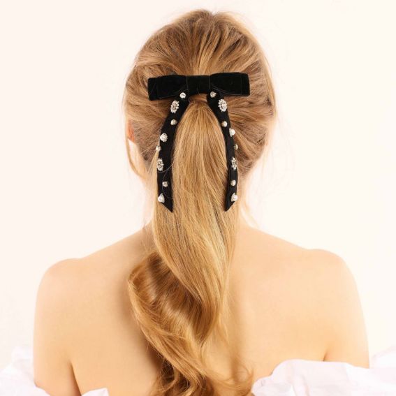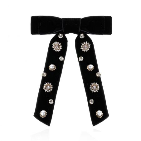 In deze geest introduceert ons thema Like a Virgin de Carmela haarspeld, een gedurfd sieraad van zwarte flanel, versierd met een XXL-strik met linten bezet met glinsterende strass-steentjes. Een echt statement accessoire dat een verfijnde gothic touch toevoegt aan al je kapsels en je liefde voor deze donkere en betoverende trend bevestigt.