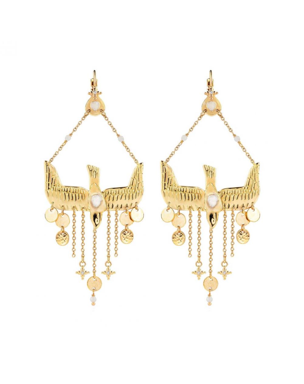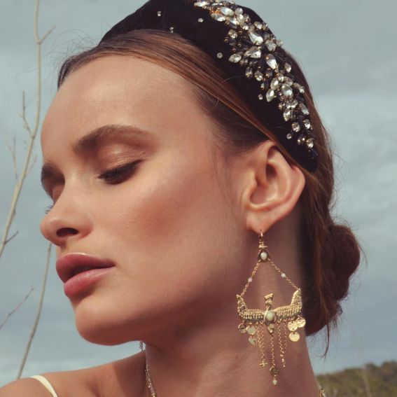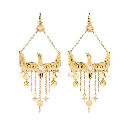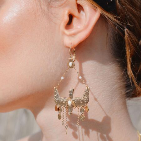 Spectaculair en bohemian: MENNY onthult een handgesneden gouden zwaluw, verfraaid met een parelmoeren cabochon en glinsterende kwastjes. Gemonteerd op een dwarsligger vangt dit mobiele object het licht en de blik bij elke beweging.