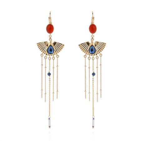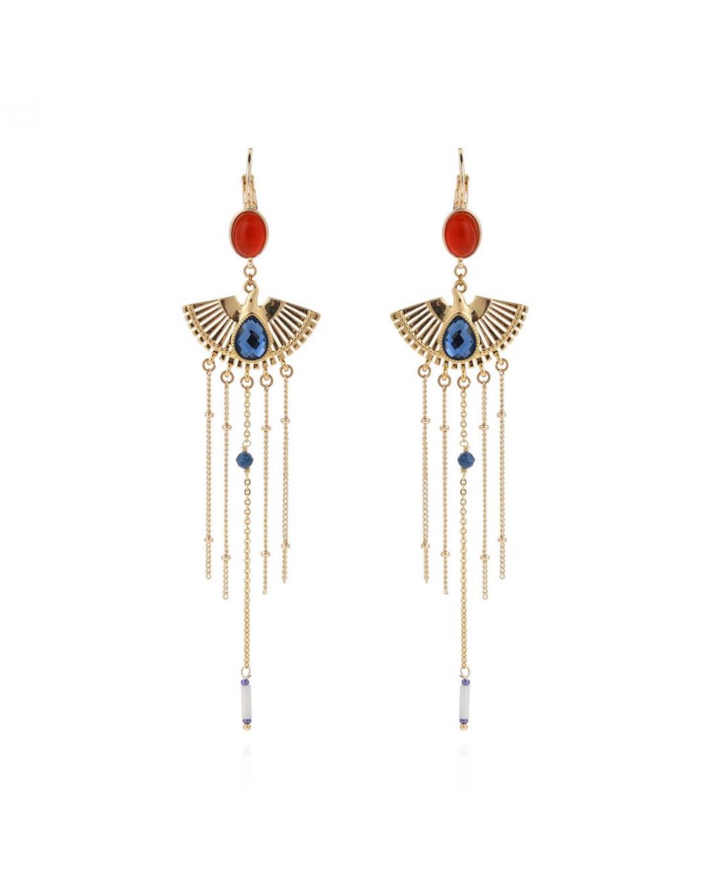 Geïnspireerd door talismannen en inrô, combineren de NATIV oorbellen parelmoer, strass-steentjes, blauw emaille en gekleurde stenen in een spectaculaire gouden cascade. Een gestileerde vogel en een lichtgevende parelkwast completeren dit uitzonderlijke sieraad met mystieke elegantie.