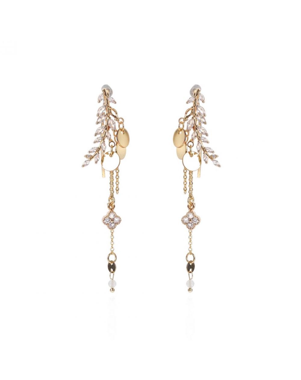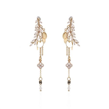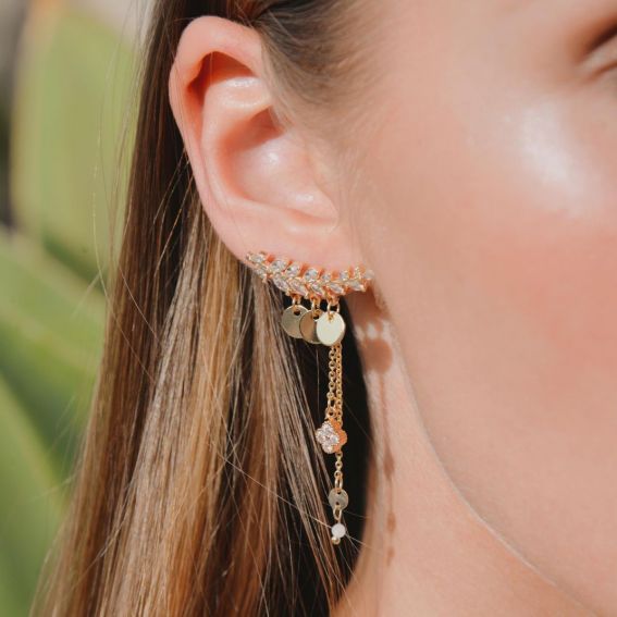 De ORNELL- oorbellen volgen de ronding van het oor subtiel en onthullen een verfijnde korenaar, versierd met kwastjes, een klavertjevier met strass en een maansteenparel. Een stralend sieraad om de winter elegant op te warmen.