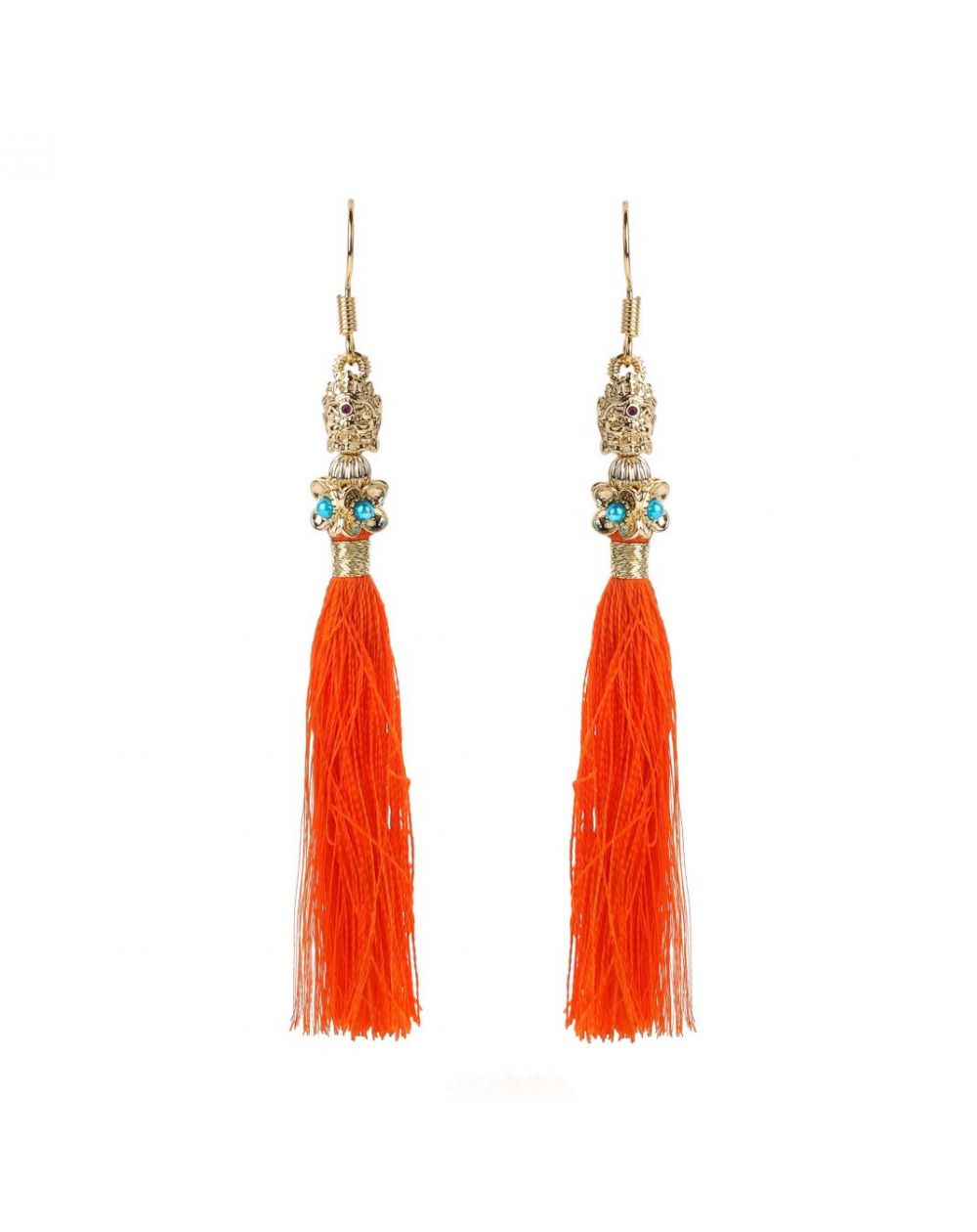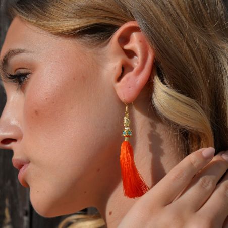 De SELSA- oorbellen, bekroond met een Boeddhahoofd en een bloemparel met blauwe stampers, eindigen in een weelderige oranje zijden kwast. Een gedurfd en spiritueel sieraad dat sierlijk rond het gezicht danst.