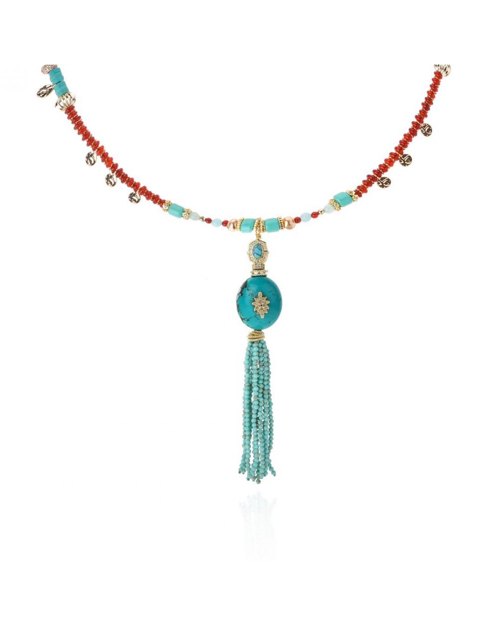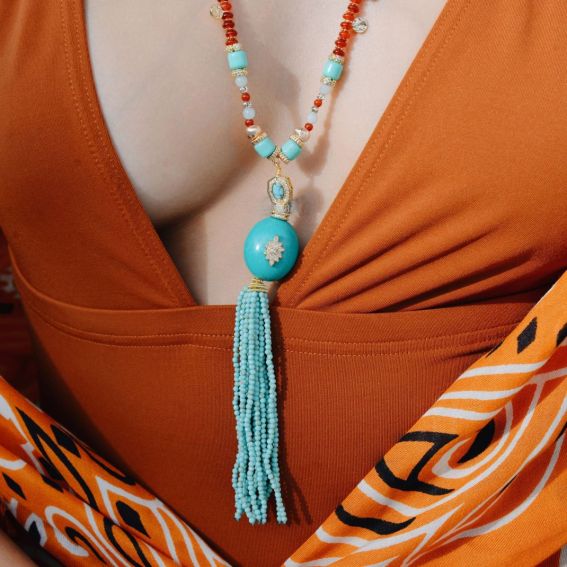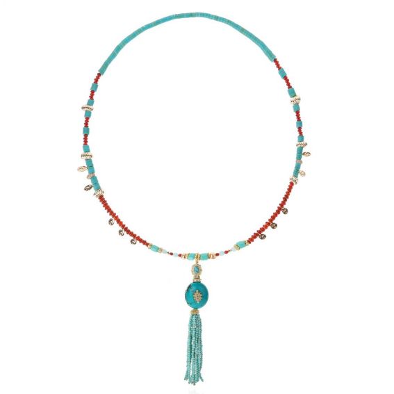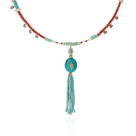 Geïnspireerd door boeddhistische en Indiase tradities combineert AGLAE turquoise en amberkleurige granaatkralen met een vleugje goud. De verfijnde turquoise kwast, die aan een opvallende centrale kraal hangt, maakt het een stralende en iconische ketting.