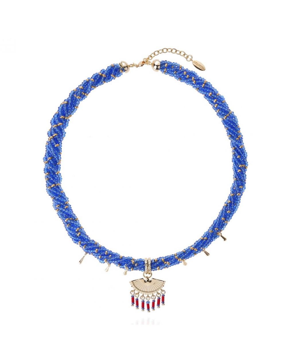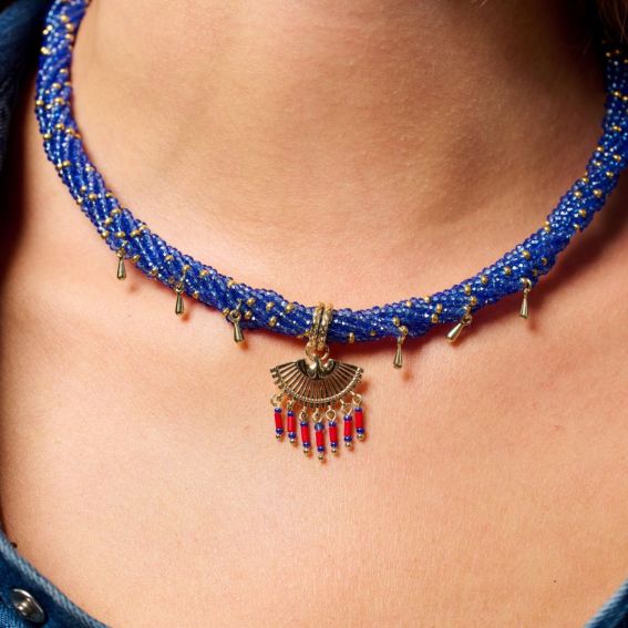 De BILKIS-ketting, verguld met fijn goud, viert de inspiratie van de Native Americans met zijn blauwe textielvlecht, gouden kwastjes en handgesneden centrale adelaar. Een krachtig en symbolisch sieraad met ambachtelijke charme.