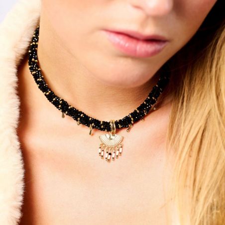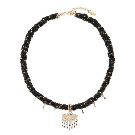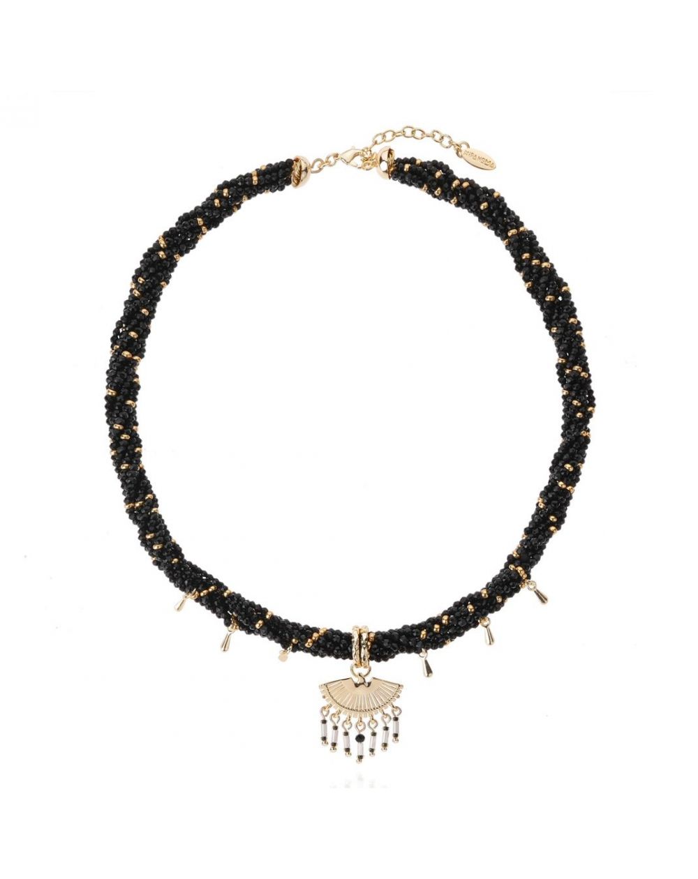 BILKIS is geweven van zwart textiel en versierd met gouden kralen. De iconische adelaar van HIPANEMA is zorgvuldig met de hand gesneden. De kralenstaart, geïnspireerd op Navajo-motieven, creëert een krachtig en verfijnd sieraad.