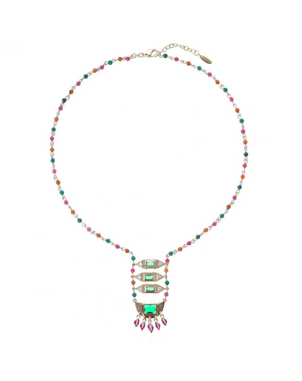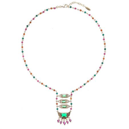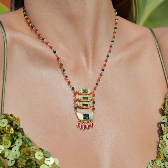 Passend bij de SOLEDAD-oorbellen verleidt FINAYA met zijn kleurrijke rozenkransketting en ladderstructuur versierd met smaragdgroene stenen, sprankelende strass-steentjes en padparadscha-roze kwastjes. Een uitzonderlijk sieraad met een betoverende charme.