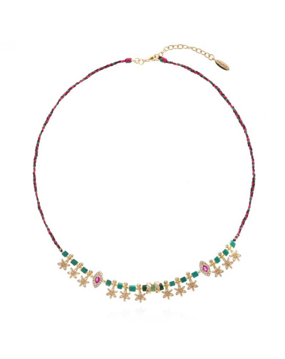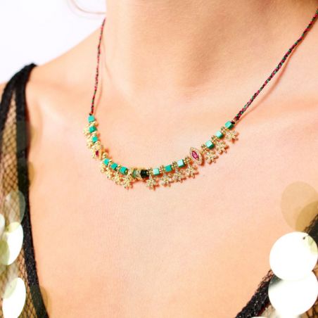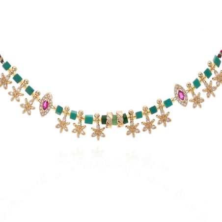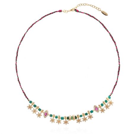 Samengesteld uit malachiet, gouden kwastjes en roze padparadscha cabochons, verleidt JADESSY met zijn harmonie van tinten en fantasierijke tweekleurige vlecht. Een handgemaakt juweel, oogverblindend en uniek, met kostbare elegantie.