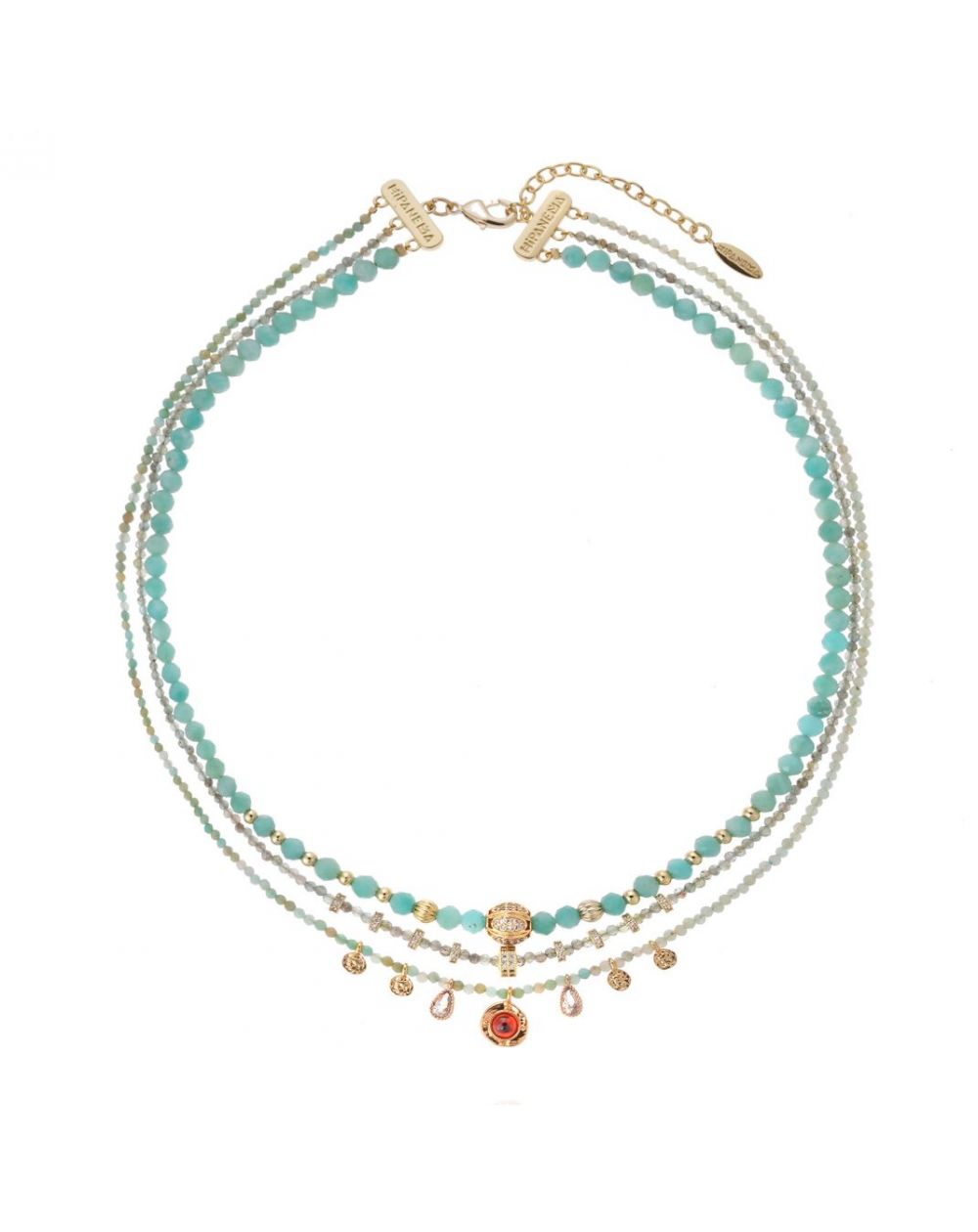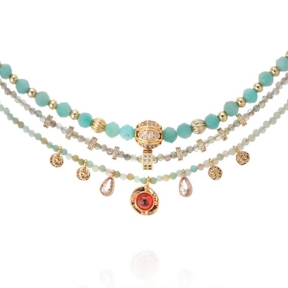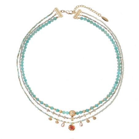 Verguld met fijn goud, speelt de JOLANE-ketting met elegantie met drie rijen amazonietkralen. Gefacetteerd, doorschijnend of versierd met strass-steentjes, vermengd met delicate kwastjes en een centrale cabochon met granaatreflecties. Een verfijnd sieraad, volledig handgemaakt, dat het hoofd met poëzie accentueert.
