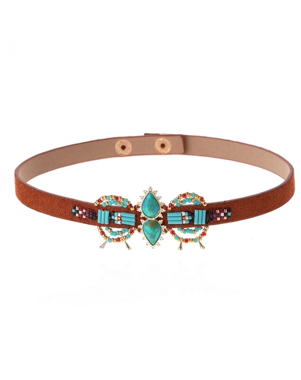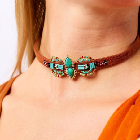 Deze handgeborduurde ketting, gemaakt van kameelkleurig suède, combineert turquoise, granaat en gouden kralen in een patroon geïnspireerd op de kunst van de indianen. De centrale cabochon en turquoise druppels maken het een harmonieus, sterk en verfijnd sieraad.
