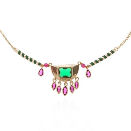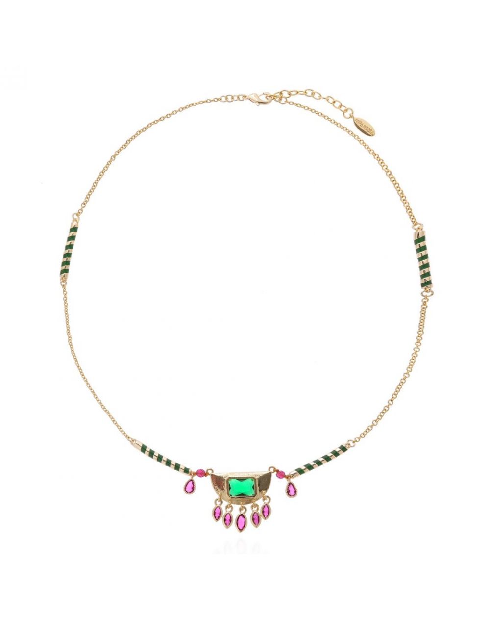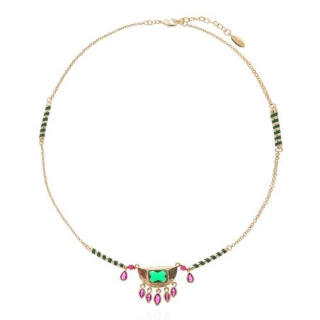 Deze handgeborduurde ketting, gemaakt van kameelkleurig suède, combineert turquoise, granaat en gouden kralen in een patroon geïnspireerd op de kunst van de indianen. De centrale cabochon en turquoise druppels maken het een harmonieus, sterk en verfijnd sieraad.
