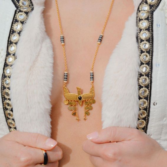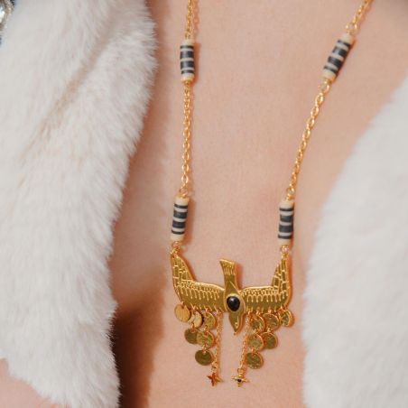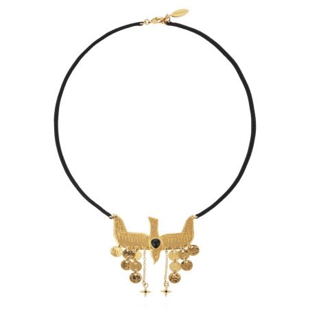 Hangend aan een geglazuurd katoenen koord spreidt de gouden duif van de NIPOA- ketting haar vleugels in een delicate vlucht. Twee cascades van gouden pailletten verfraaien dit handgemaakte sieraad met een stralende en evenwichtige charme.