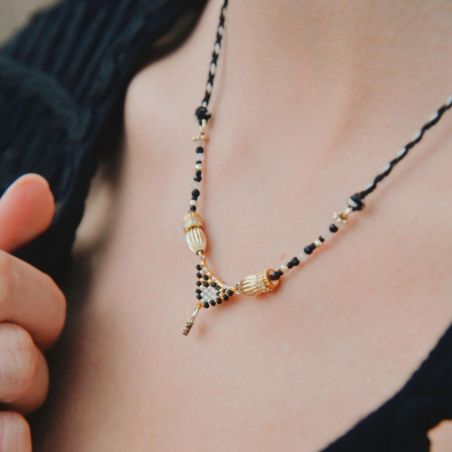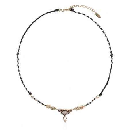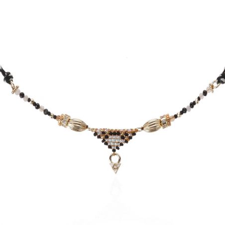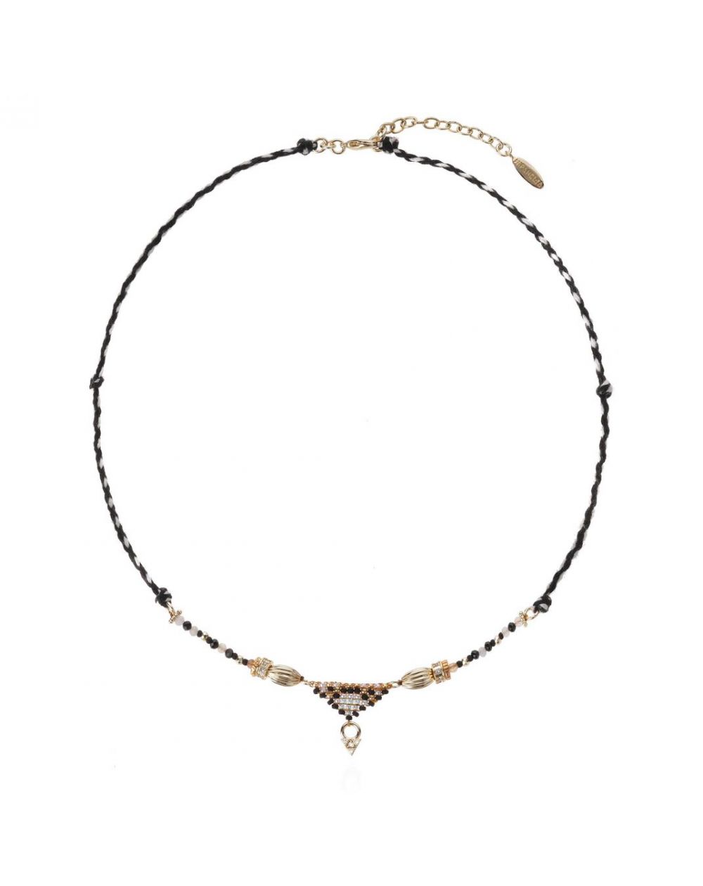 Gevlochten in zwart-wit katoen, onthult PARAISO in het midden een gouden driehoek omlijst met labradoriet- en onyxkralen . De ring met strasssteentjes geeft dit sieraad een vleugje sprankeling met zijn verfijnde en perfect uitgebalanceerde ontwerp.