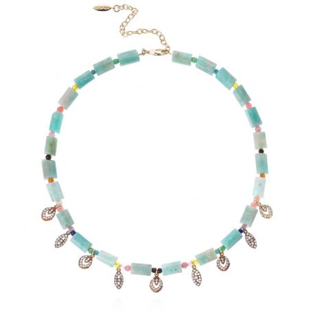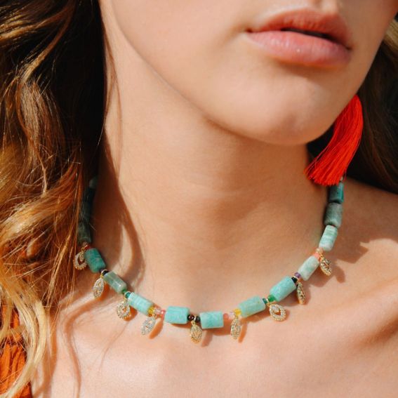 De PIAD- ketting, samengesteld uit amazonietkralen en veelkleurige accenten, verleidt met zijn negen ovale strass-kwasten. Een stralend sieraad met bohemian charme, perfect om de winter elegant op te warmen.