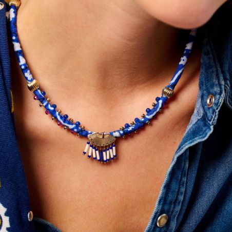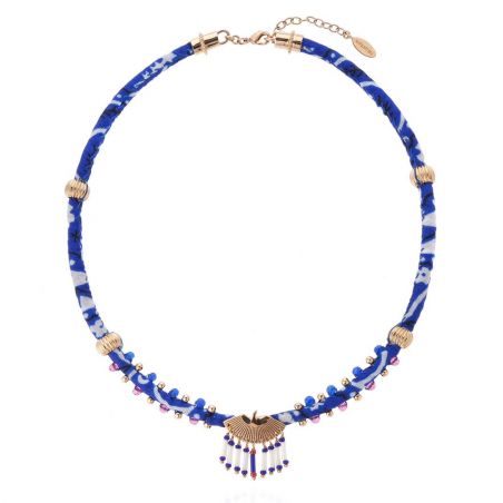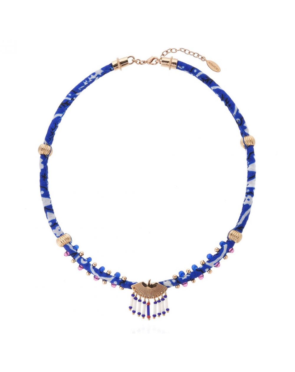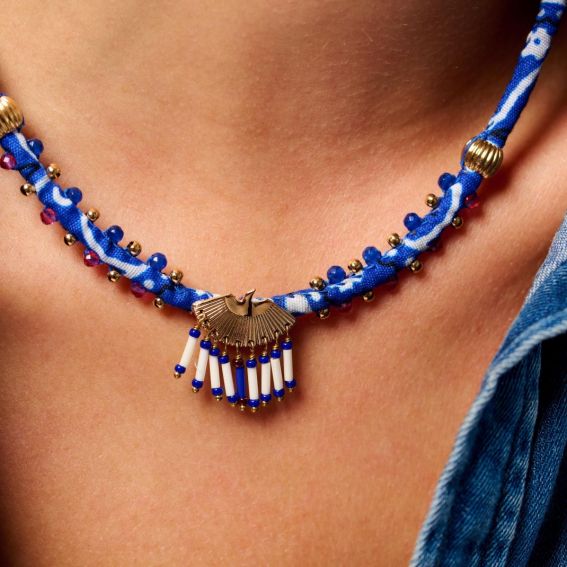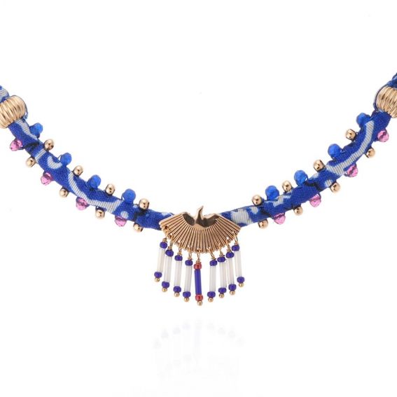 De SWANNY- ketting, gedraaid als een bandana en geborduurd met parels, toont de gestileerde adelaar van de collectie, versierd met lapisblauwe en witte parels. Een iconisch sieraad met een kenmerkende, ambachtelijke charme.