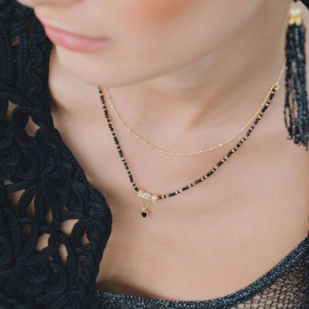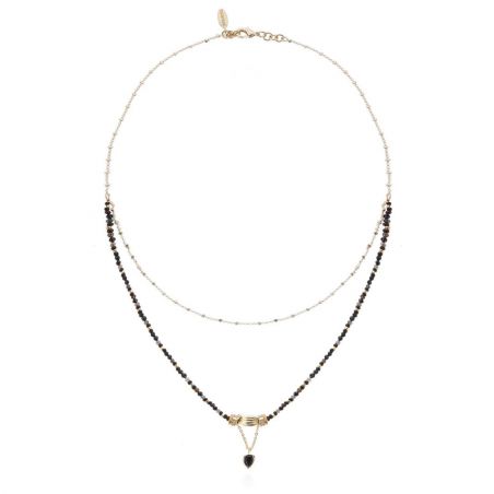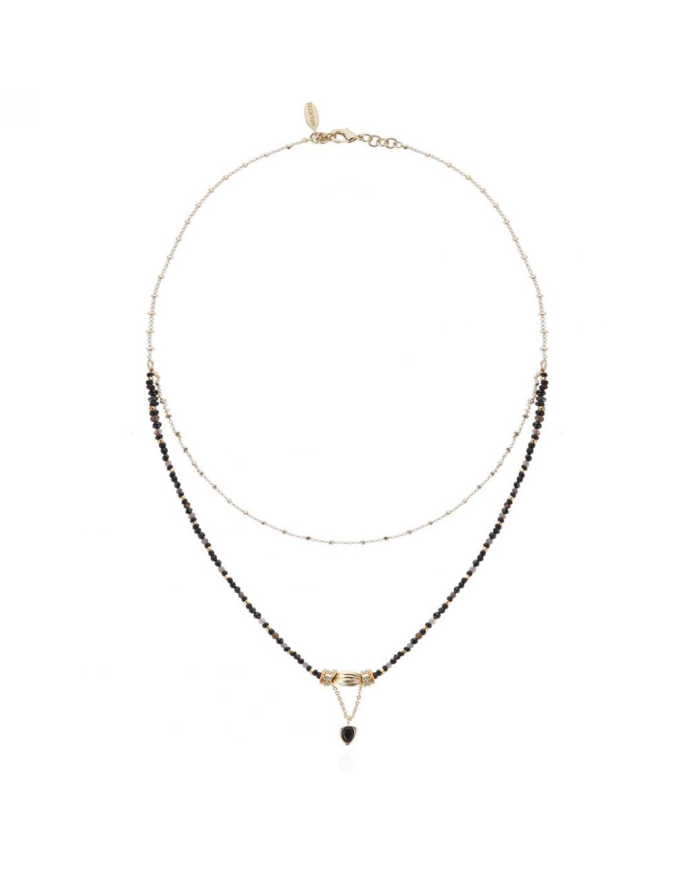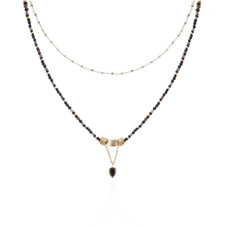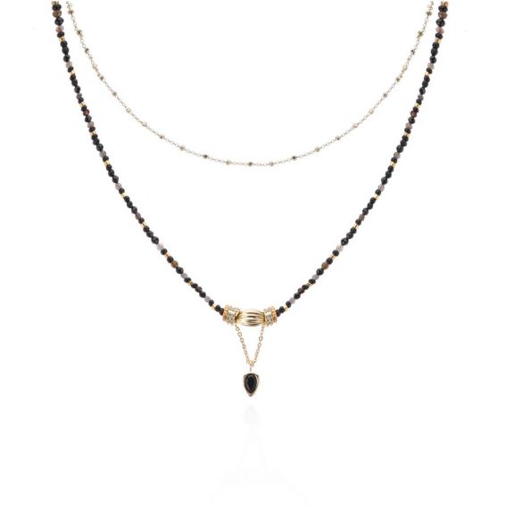TALENA combineert een gouden rozenkransketting met een streng zwarte onyx- en labradorietkralen . In het midden zorgt een onyxdruppel voor de finishing touch van deze verfijnde en makkelijk te combineren dubbele ketting .