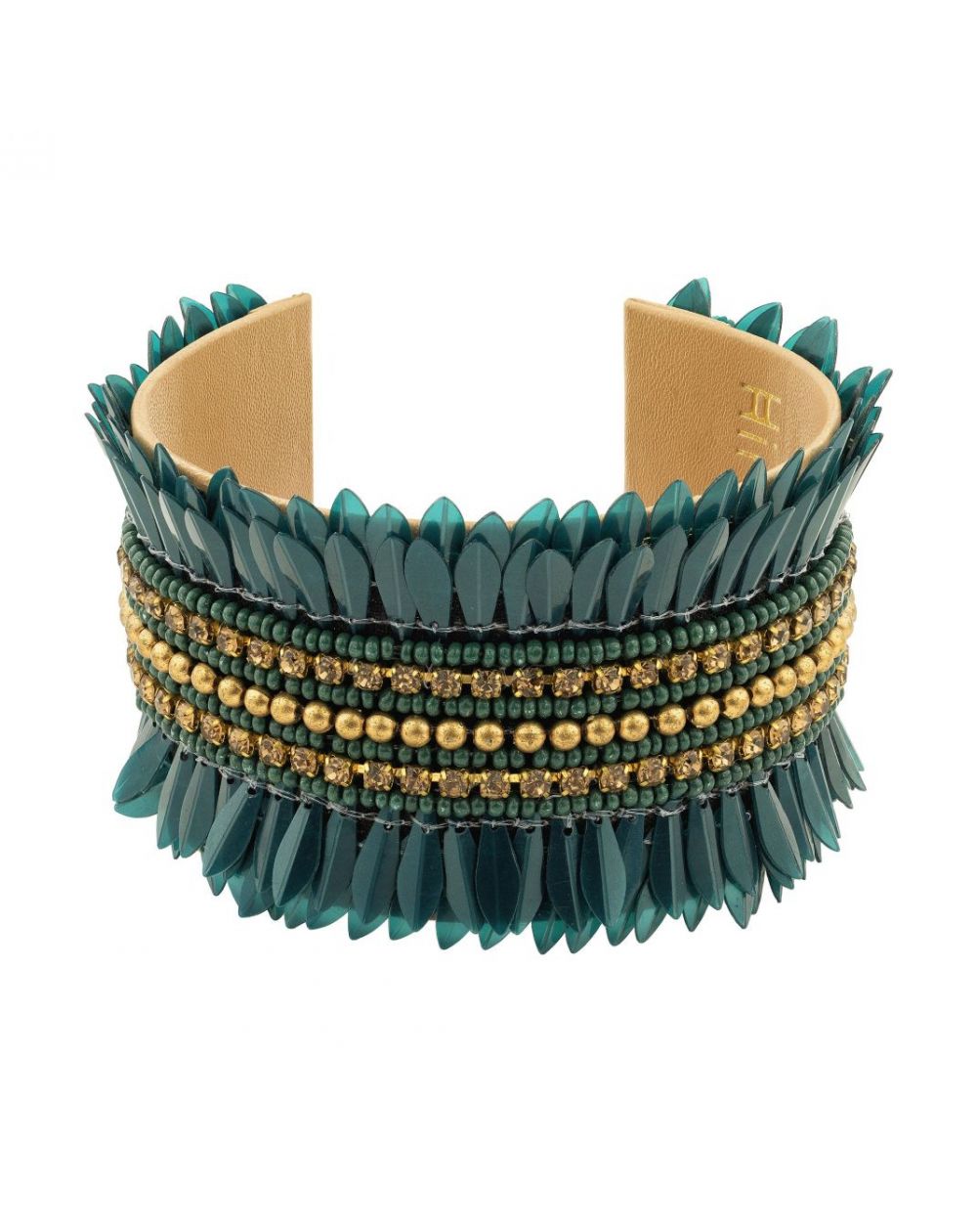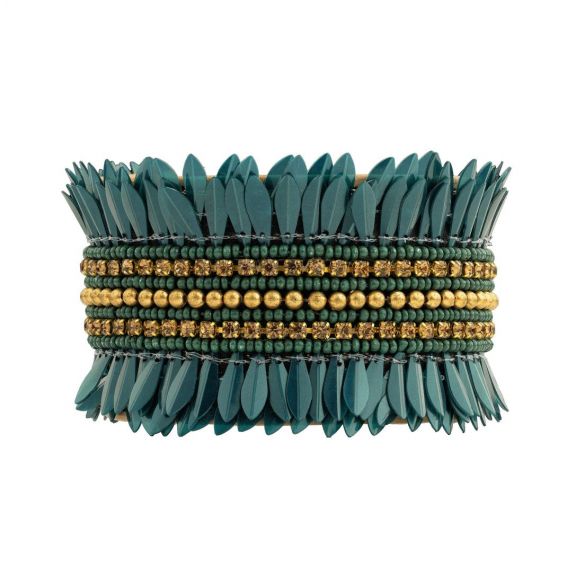 De BENSON manchet is volledig versierd met kralen op een basis met leereffect en heeft prachtige symmetrische bloemblaadjes en een centrale gouden band. Chic en opvallend, kan hij los gedragen worden of over een trui voor een sculpturale look.
