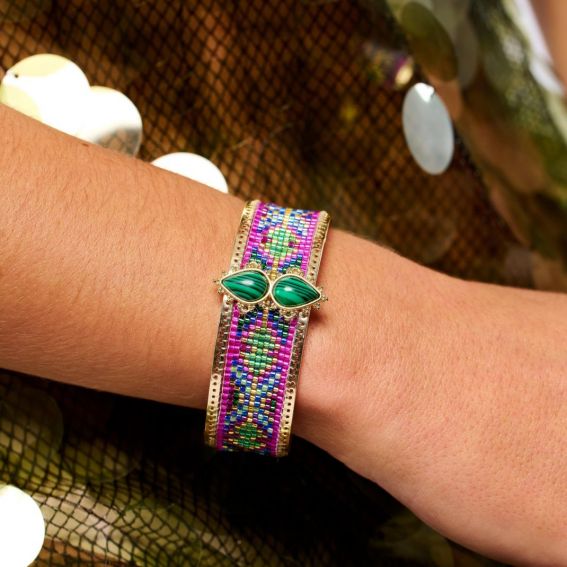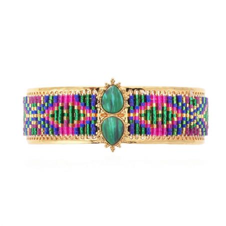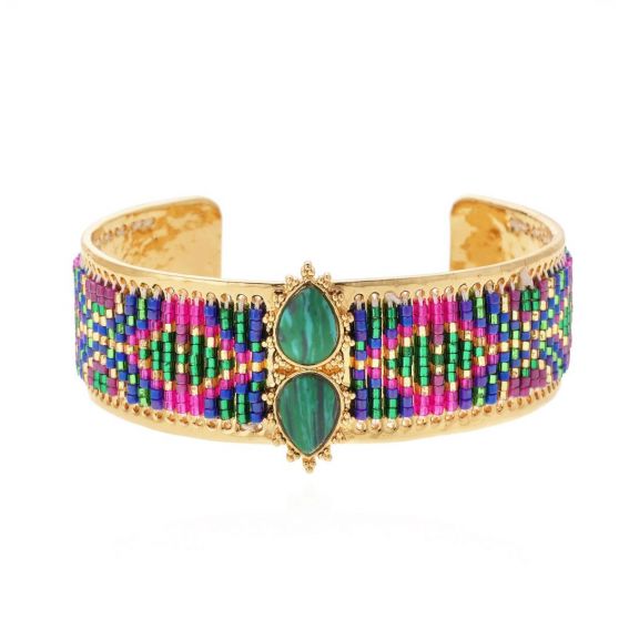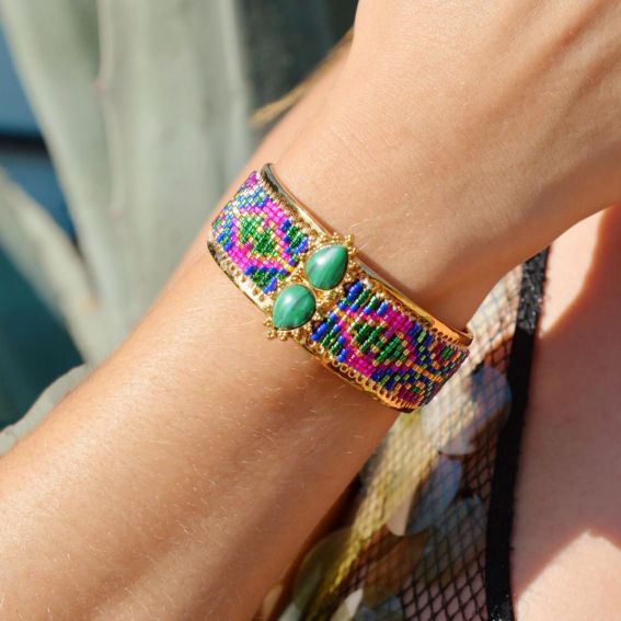 De Frisco- bangle is volledig met de hand gehamerd en geborduurd en valt op door de grafische kralenpatronen en de centrale cabochon versierd met druppels met malachieteffect. Verkrijgbaar in verschillende kleuren, kan hij afzonderlijk worden gedragen of worden gestapeld voor een gedurfde stijl.