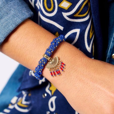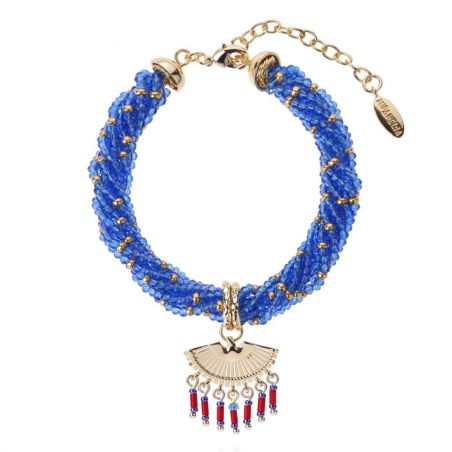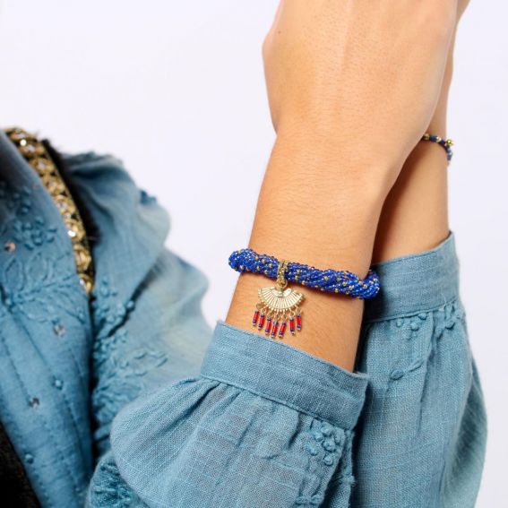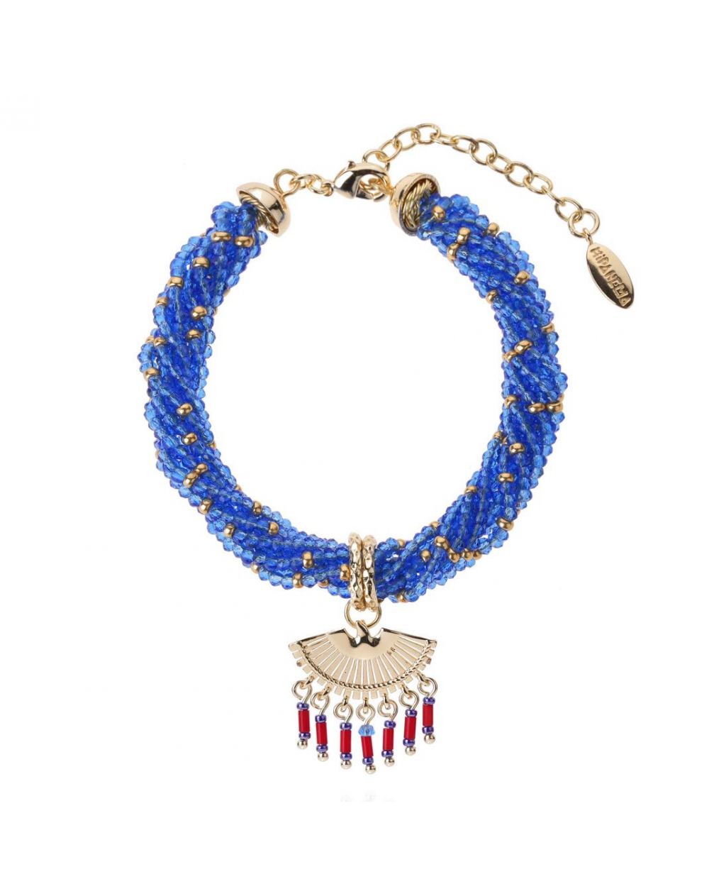 De NALI- armband is gemonteerd op een blauwe vlecht, geborduurd met gouden kralen, en is voorzien van de iconische HIPANEMA-adelaar. De lapisblauwe kralenstaart onthult een Navajo-geïnspireerd motief, voor een handgemaakte en symbolische touch.