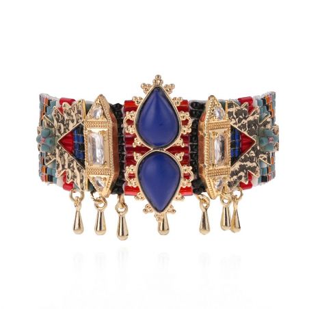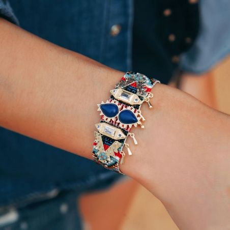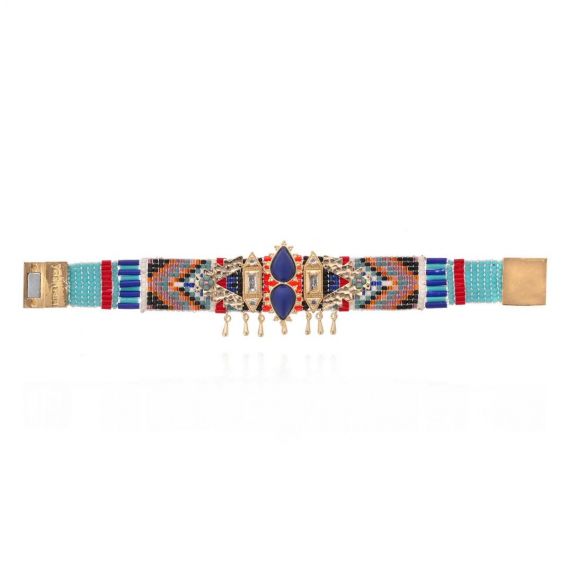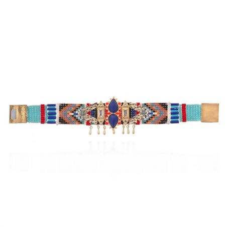 Met zijn verfijnde vlechtwerk van lapisblauwe, bronzen, rode en ivoorkleurige kralen belichaamt de RANYA- manchet de elegantie van HIPANEMA. Diamantvormige cabochons, druppelvormige kwastjes en een magnetische sluiting creëren een weelderig sieraad met een delicate beweging.