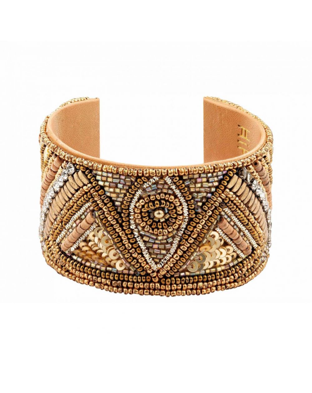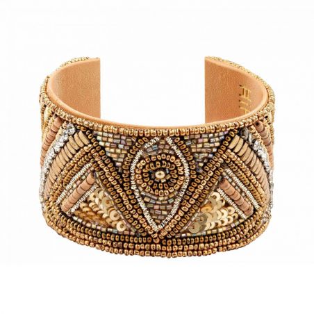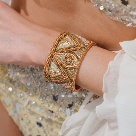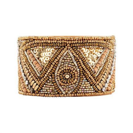 De RIVOLTA manchet is aan de achterkant open en combineert comfort en stijl. Gouden kralen, sprankelende strass-steentjes en lichtgevende pailletten creëren opvallende tribalpatronen en vormen zo een oogverblindend en uniek sieraad.