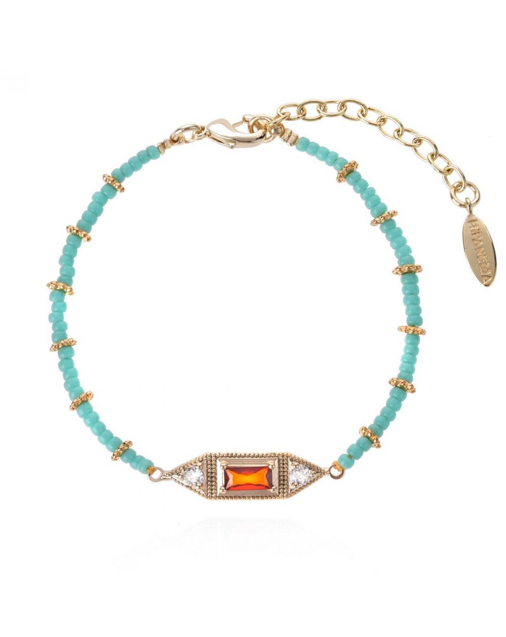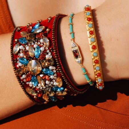 SOUDANA is een delicate mix van turquoise kralen en gouden bloemendetails. Een gefacetteerde cabochon met granaatkleurige accenten en strass-steentjes in het midden verlicht dit delicate, bohemian sieraad met verfijnde charme.