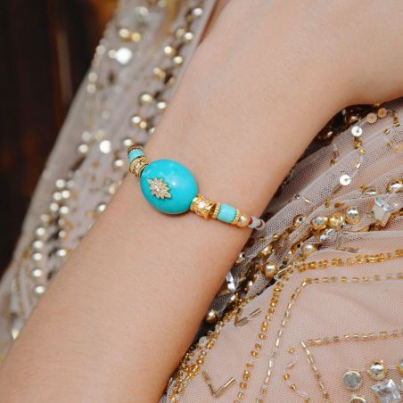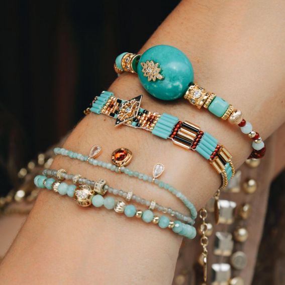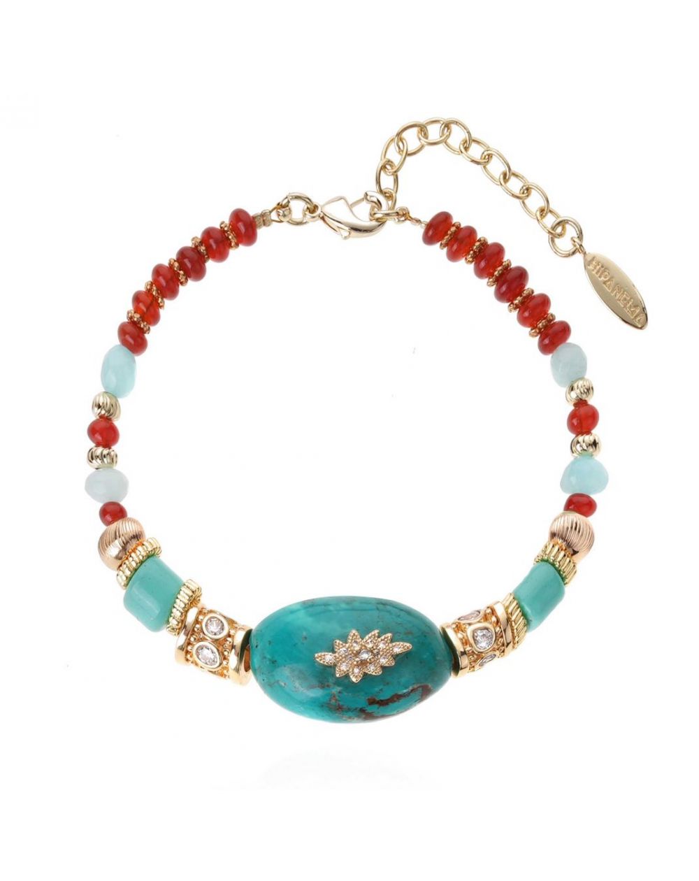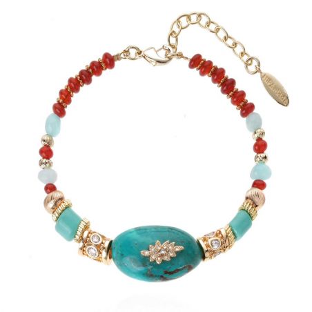 TAJAR betovert met zijn intens gekleurde parels – turkoois, granaat en amazoniet – en de majestueuze centrale steen. Een gouden bladkwast geeft dit uniek charmante bohemian sieraad een natuurlijke touch.