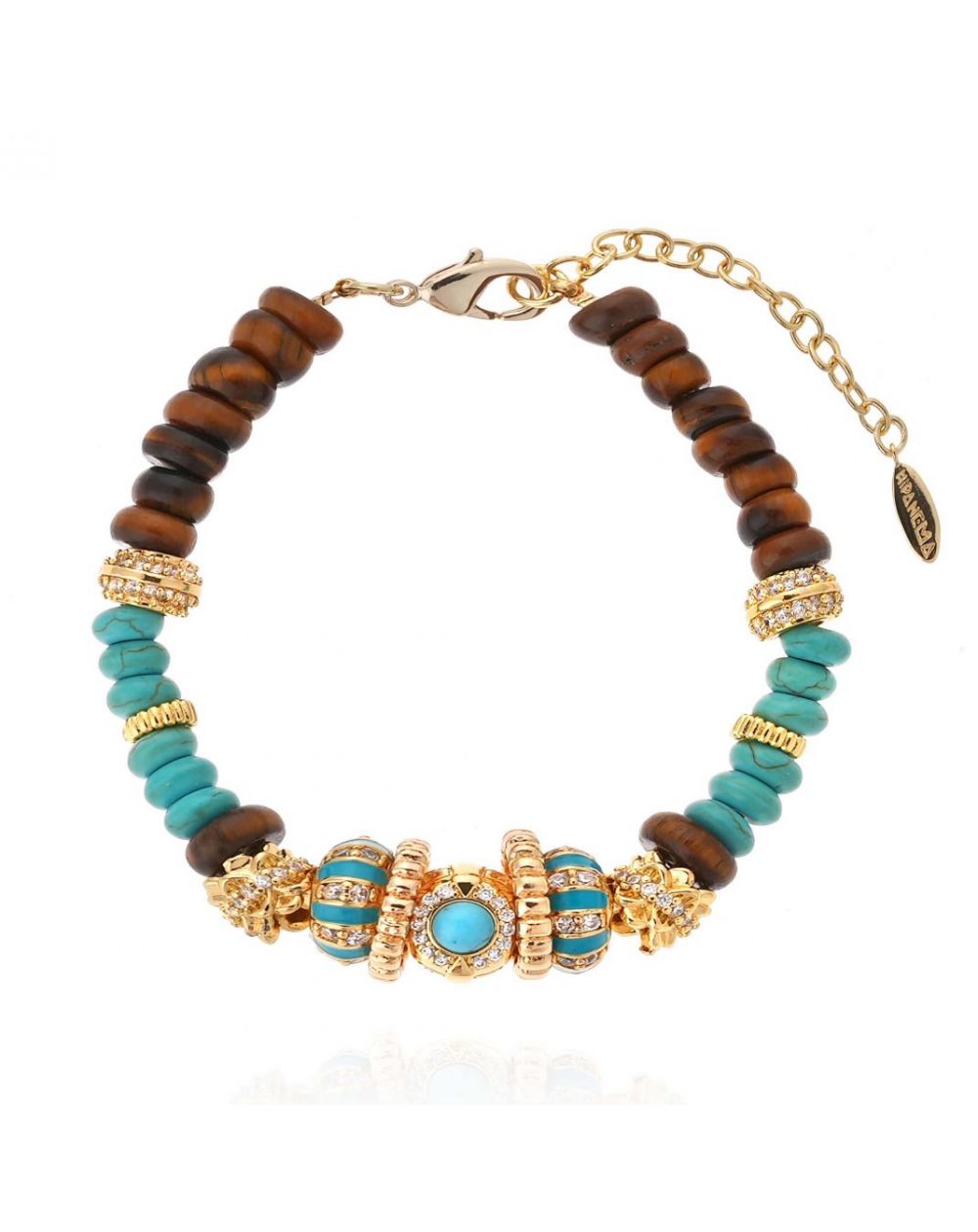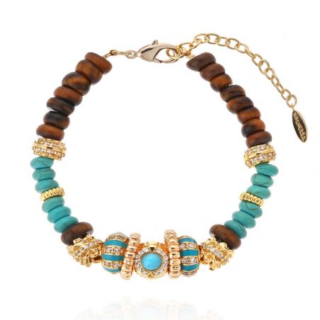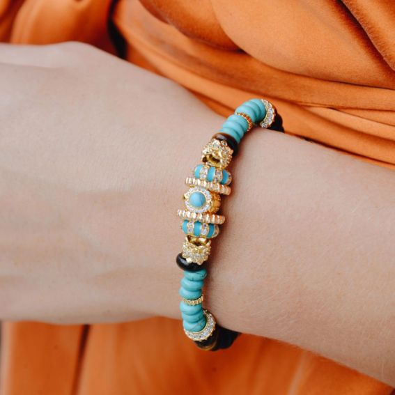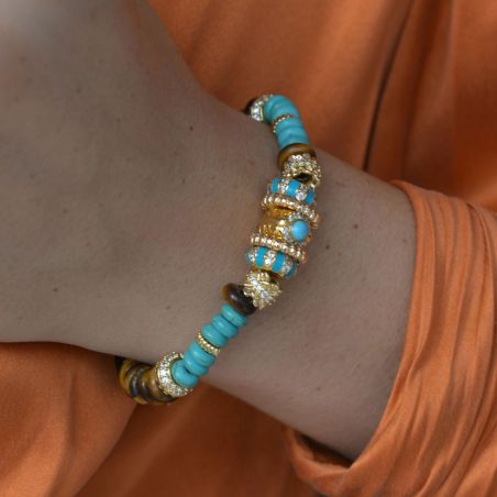 TUXI combineert turquoise en tijgeroogkralen met strass-kwasten voor een verfijnde look. Een zegelring-cabochon in het midden geeft dit elegante en stralende sieraad een kostbare touch, perfect voor de winter.