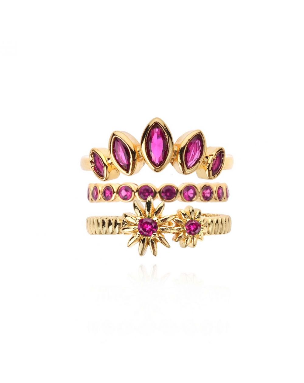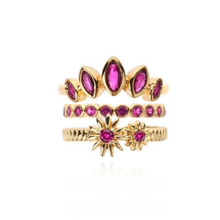 In fuchsia combineert JACINTA drie verfijnde ringen: een kroon versierd met robijnroze marquise-stenen, een delicate ring in een kast en een gecanneleerde ring versierd met fonkelende madeliefjes. Een stralende en ultravrouwelijke combinatie.