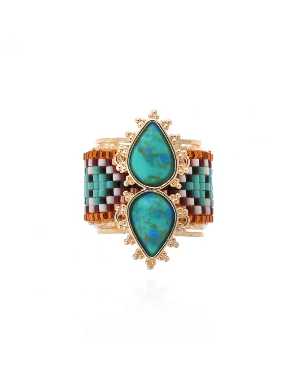 De VIVA turquoise ring, verguld met fijn goud en met de hand gehamerd, combineert turquoise, witte en bronzen kralen met een centrale cabochon van symmetrische turquoise druppels. Een levendig sieraad met handgemaakte elegantie.