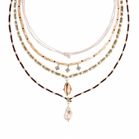 - Derde schakel : harmonieuze afwisseling van gouden en parelmoeren schijven, met in het midden een gouden kauri-hanger .