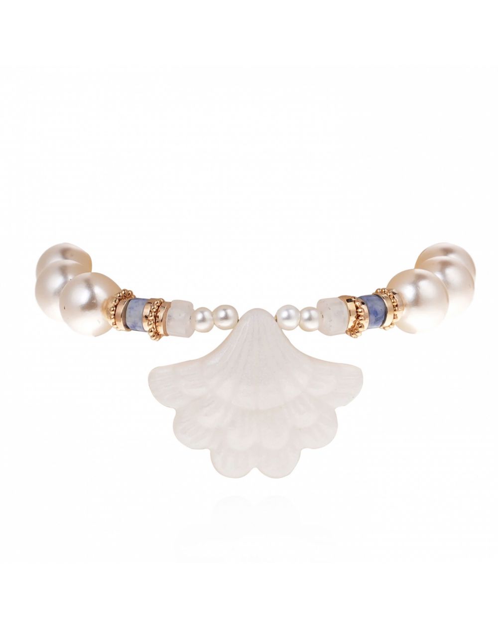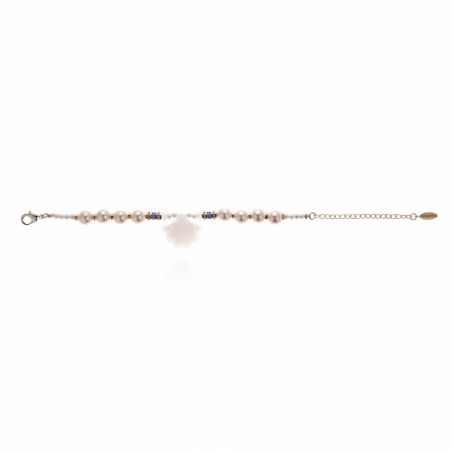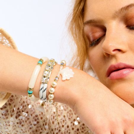 In het midden onthult een wit, kwartsachtig harsbedeltje een subtiel motief dat doet denken aan een schelppalm, een symbool van ontsnapping en zomerse gelukzaligheid. Het is omringd door imitatie zoetwaterparels, waarvan de iriserende glans de delicate schoonheid van gekweekte parels oproept. Slanke gouden rondellen accentueren het ontwerp en zorgen voor het kenmerkende contrast dat typerend is voor Hipanema-sieraden.