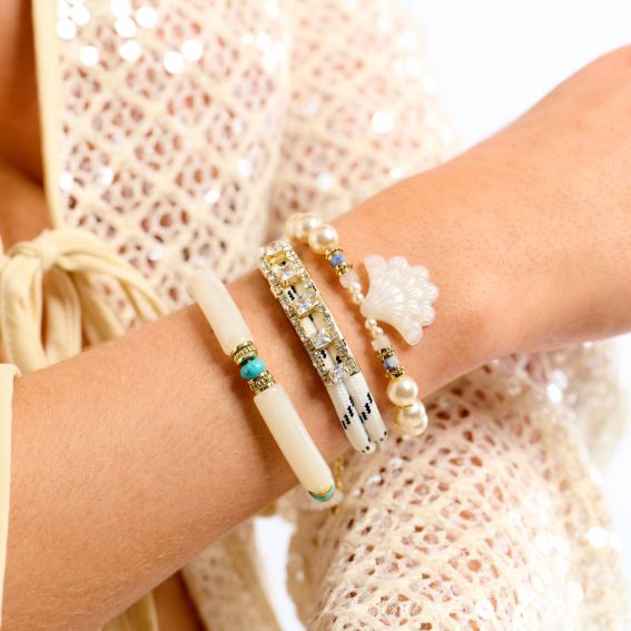De Hipanema ALLURE White armband belichaamt maritieme elegantie in zijn meest verfijnde vorm. Geïnspireerd door de onderwaterwereld combineert dit delicate sieraad de puurheid van parelwit met stralende gouden accenten voor een chique en tijdloze look.