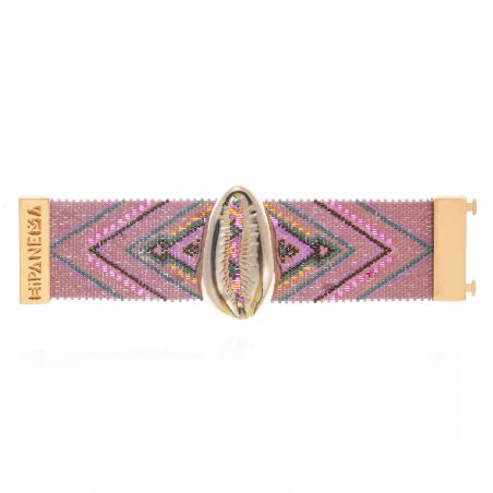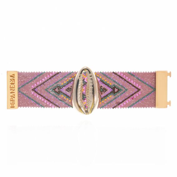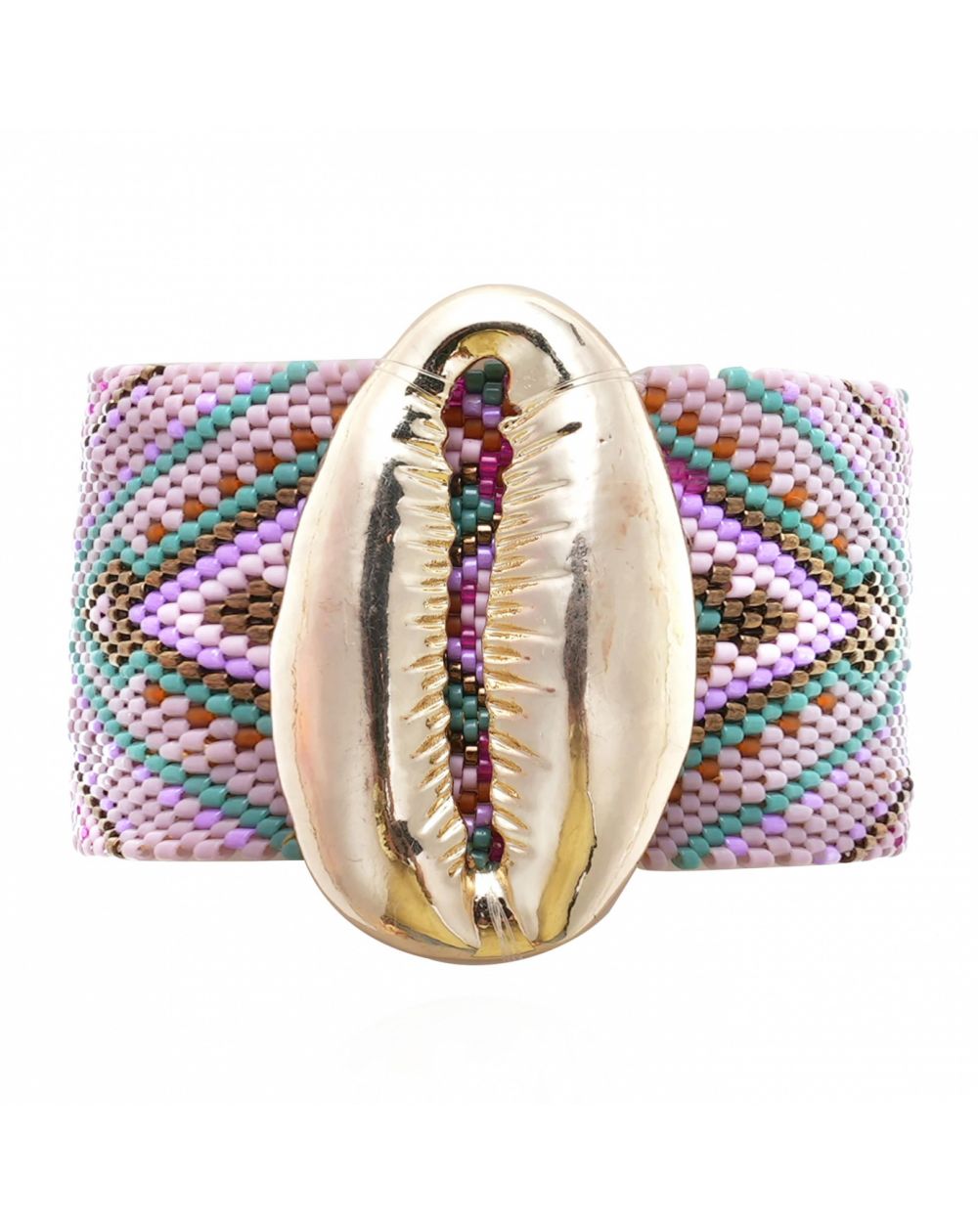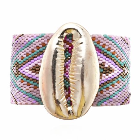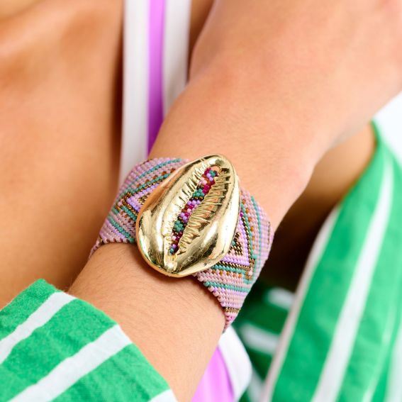 Geïnspireerd door de Navajo -esthetiek, toont deze handgemaakte manchetarmband een weelderig vlechtwerk van zorgvuldig met de hand samengevoegde Japanse kralen . Aan weerszijden prijkt een royale gouden kauri-schelp , een centraal element dat de structuur van het sieraad bepaalt en het een stralende en krachtige uitstraling geeft.