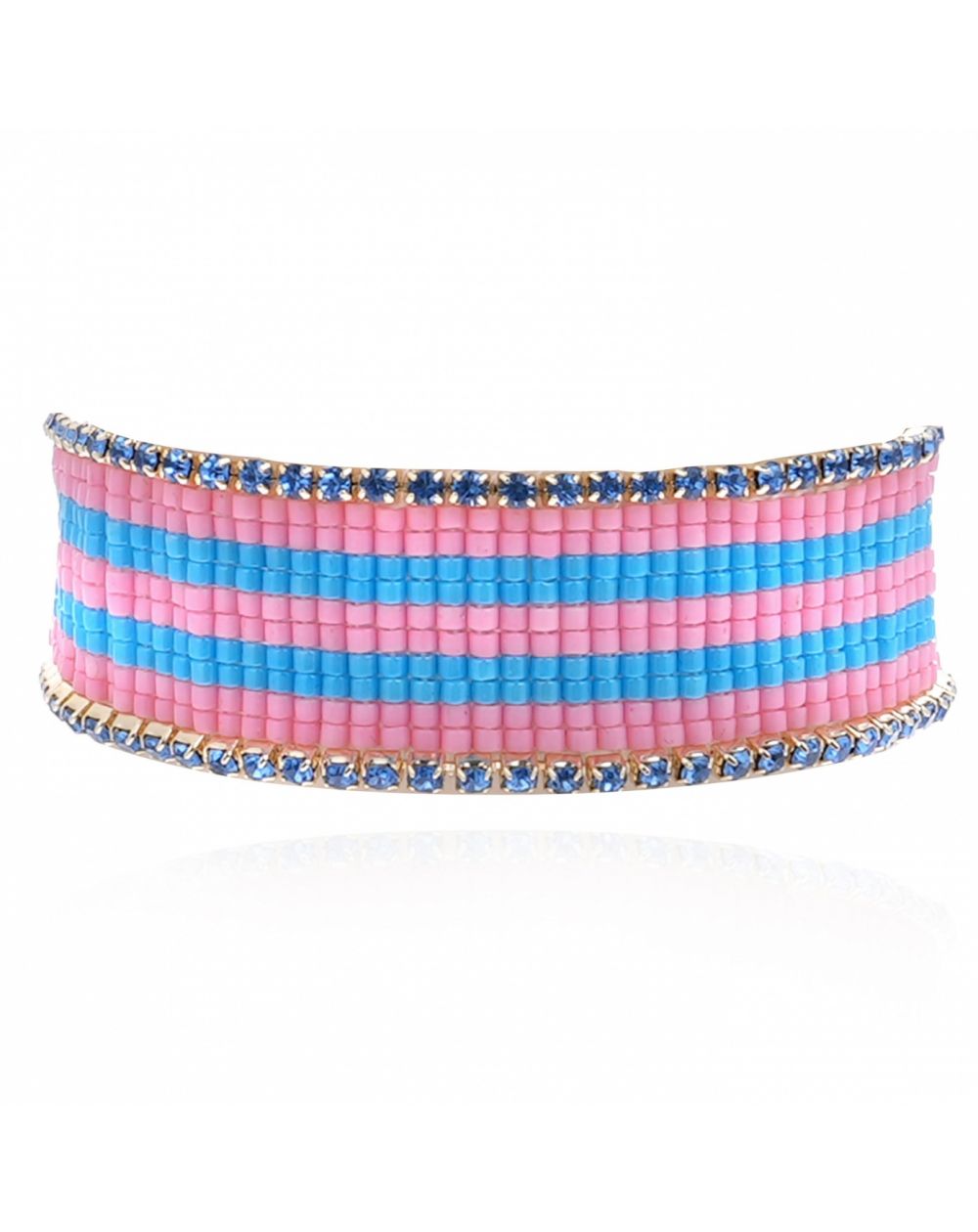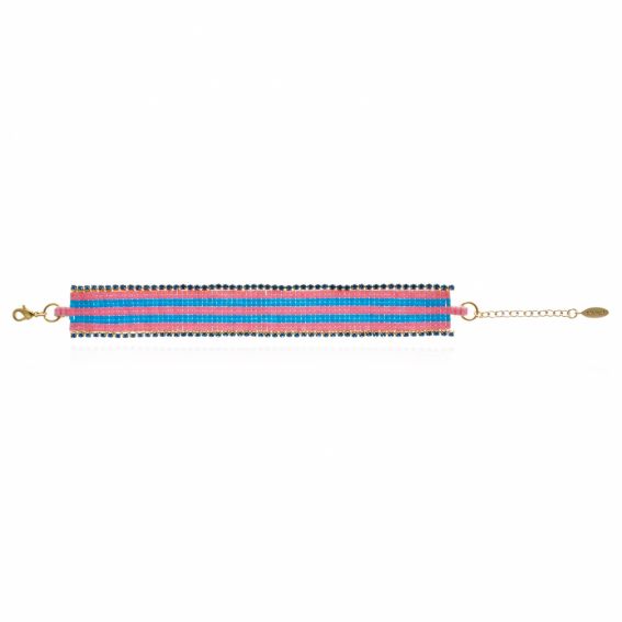 BENJIE, samengesteld uit zorgvuldig in elkaar gevlochten Japanse parels , onderscheidt zich door zijn gestructureerde visuele ritme. De blauwe versie speelt met een opvallend contrast: horizontale lijnen van felroze en cyaanblauw, geaccentueerd door een centrale band van Zwitserse blauwe topaas-effect strass-steentjes die het licht intens weerkaatsen.