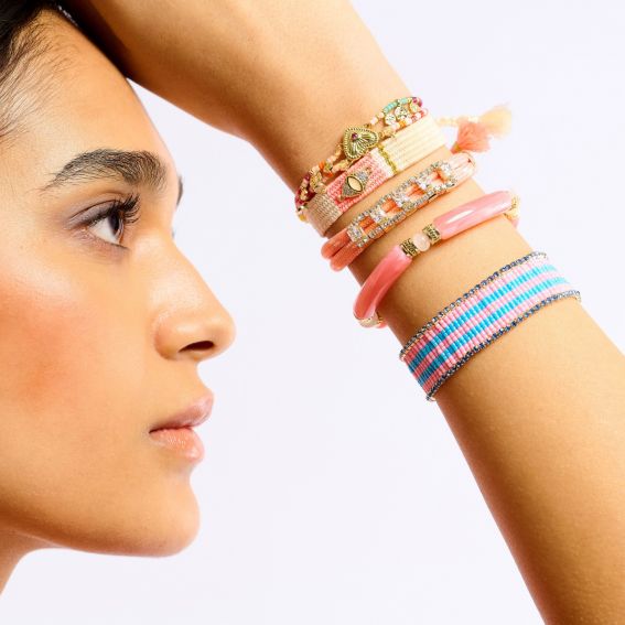 De subtiel met strasssteentjes versierde rand versterkt de kostbare uitstraling, terwijl de sluiting met verlengketting ervoor zorgt dat de armband comfortabel om elke pols past. Ideaal om een zomeroutfit een speelse twist te geven of een vleugje kleur toe te voegen aan een minimalistische look: deze grafische bohemian armband voor dames is een onmisbaar item voor dit seizoen.