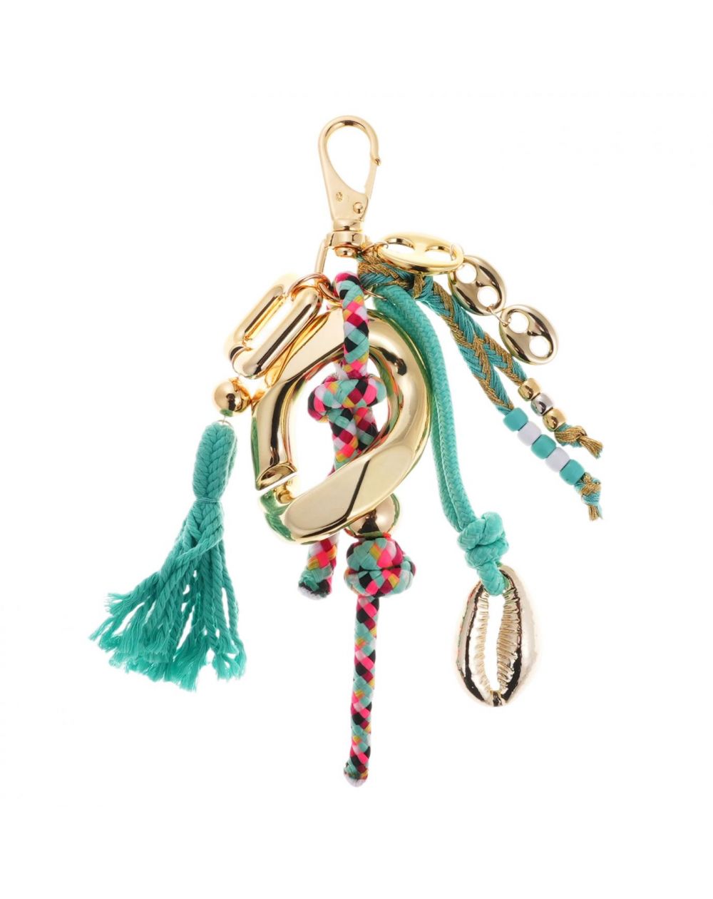 Geïnspireerd door geluksarmbandjes en bohemian snuisterijen, combineert deze turquoise tashanger kleurrijke koordjes, decoratieve bedeltjes en kwastjes tot een accessoire dat zowel speels als verfijnd is. De mix van materialen en details zorgt voor dynamiek en vangt het licht op subtiele wijze.