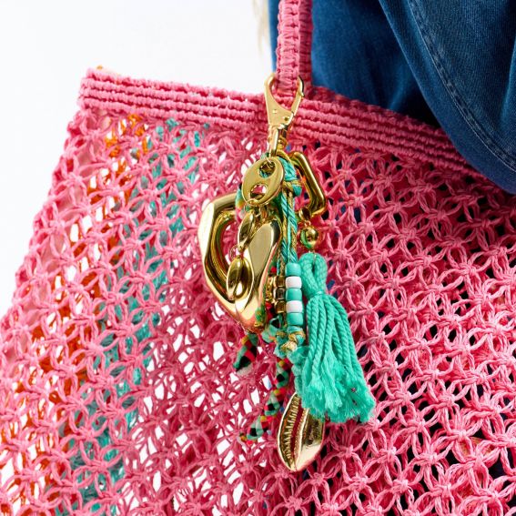 De turquoise variant betovert met zijn zonnige, zomerse uitstraling. Het voegt een frisse en levendige touch toe aan een shopper, clutch of gestructureerde tas. Ideaal voor wie houdt van opvallende accessoires, deze bohemian chique damessleutelhanger belichaamt perfect de trends van lente/zomer 2026.