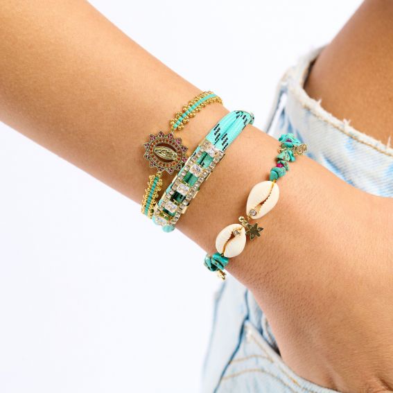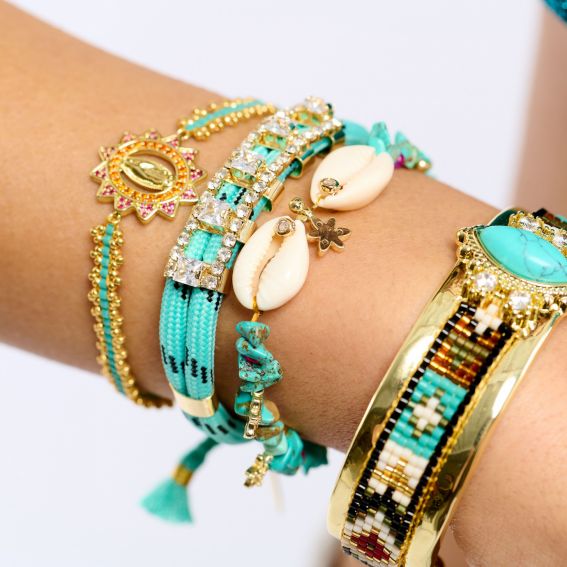 De KIKORI Turquoise armband belichaamt de energie van een stralende zomer en combineert maritieme inspiratie met delicate bloemenaccenten. Dit bohemian-chique sieraad combineert de warmte van goud met de frisheid van turkoois en siert op elegante wijze de pols.