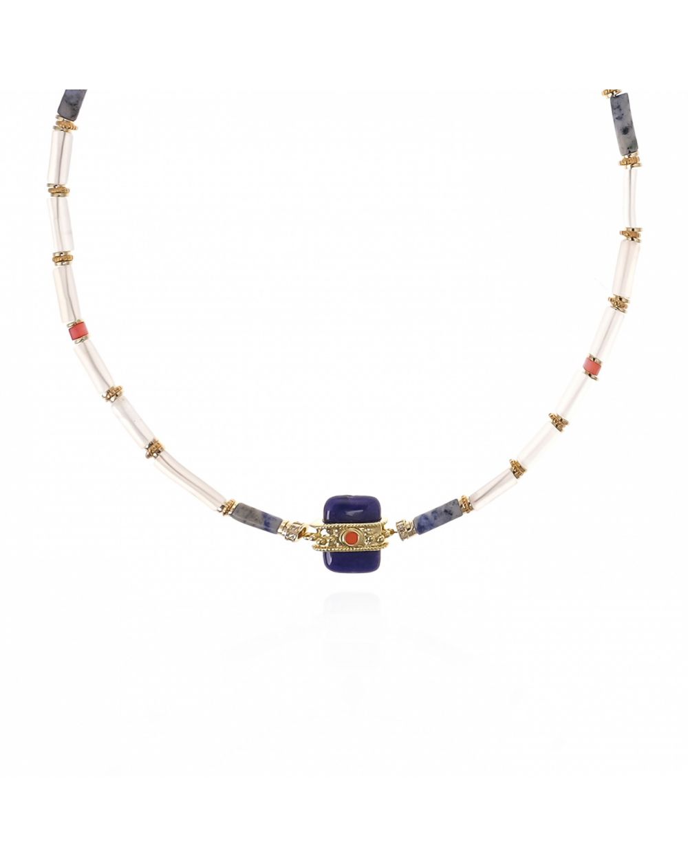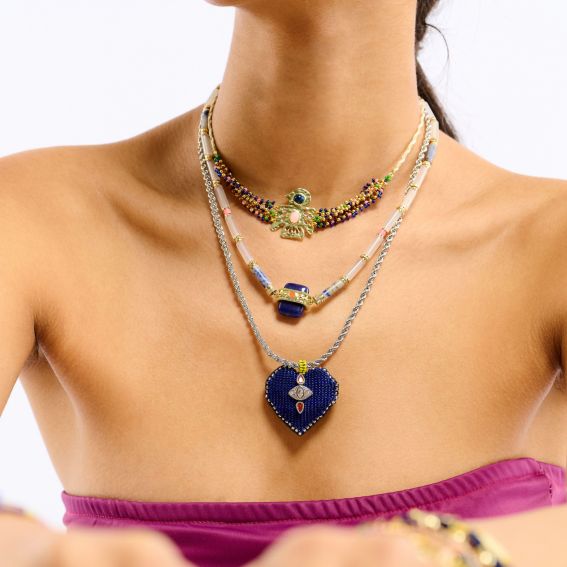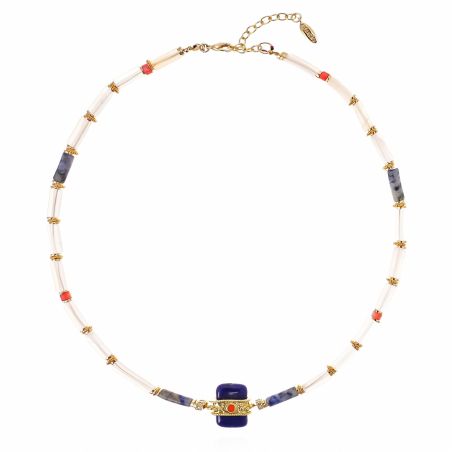 In de indigo-uitvoering combineert KOMBOU tinten licht lapis lazuli, kristal en koraal, wat resulteert in een levendig en elegant kleurenpalet. Deze blauwe stenen ketting voor dames , die perfect past bij de LOMBOK-oorringen, versterkt zowel een zomeroutfit als een meer gestructureerde, chique look.