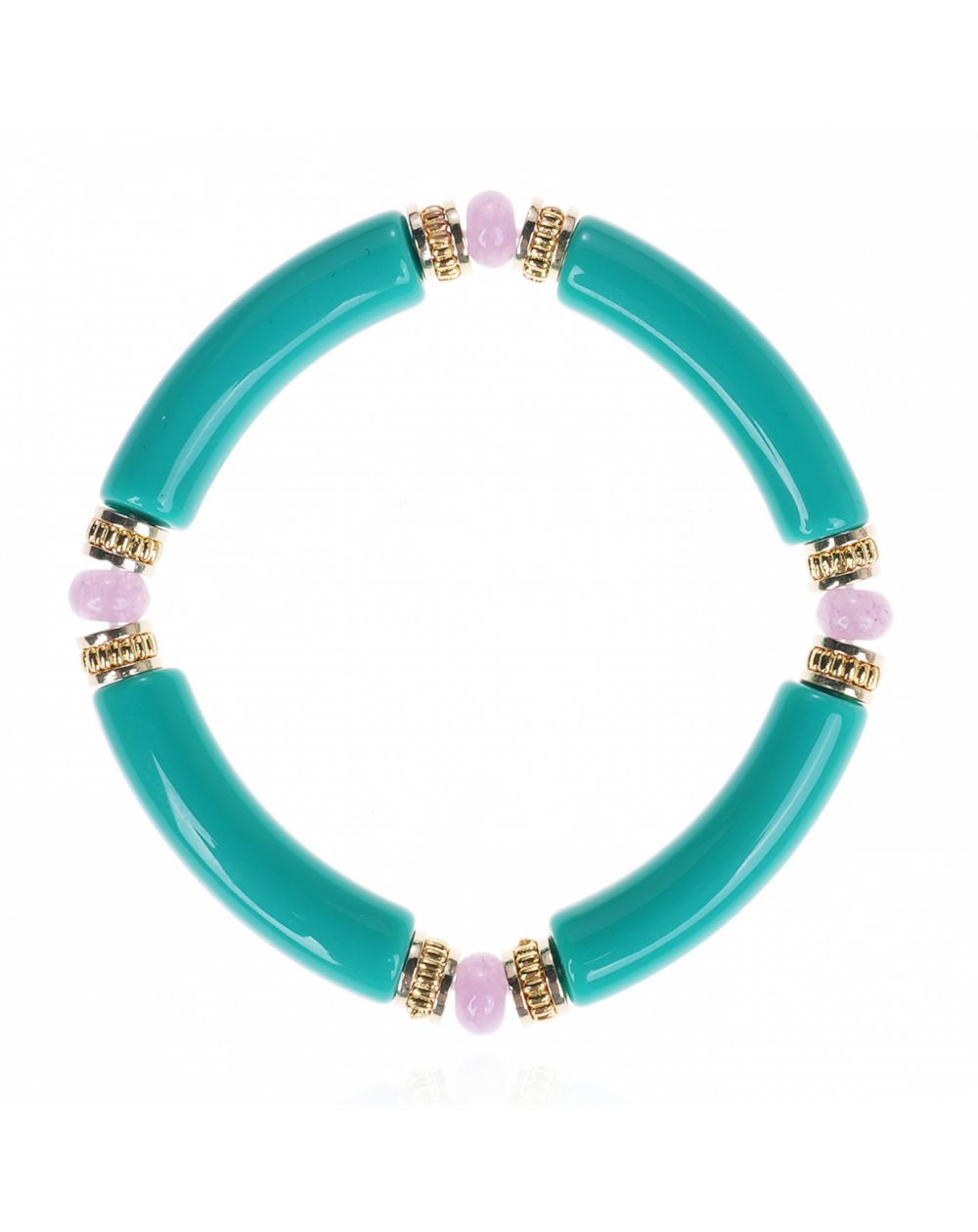 Deze armband, gemonteerd op een elastische acetaatbasis , garandeert optimaal comfort en past zich gemakkelijk aan elke polsmaat aan. Het ontwerp wisselt vier turquoise buisvormige kralen af met vier tussenruimtes die bestaan uit sierlijke gouden rondellen en contrasterende kralen.