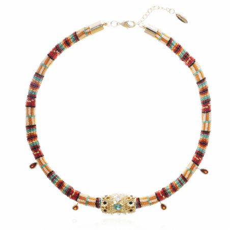 Het geweven patroon van kleurrijke buisvormige kralen creëert een textuurrijke en levendige basis. In het midden onthult een 14-karaats vergulde hanger een stralend topaasblauw hartje , subtiel omringd door bloemen bezet met strass-steentjes met diamanteffect. Dit kostbare motief voegt diepte en sprankeling toe aan het sieraad.