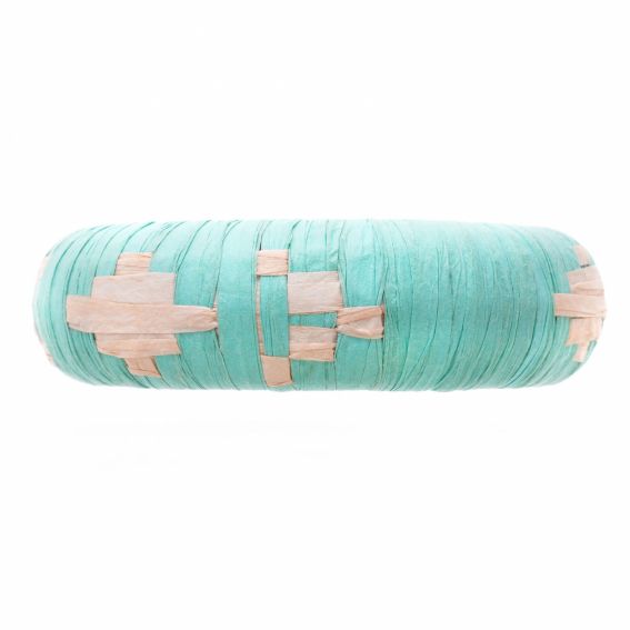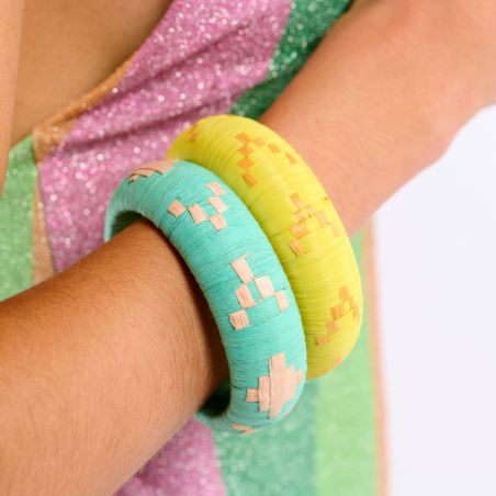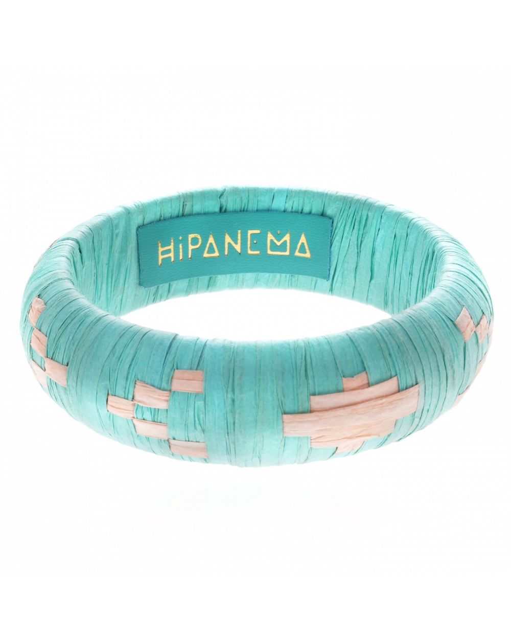 De royaal gevormde, afgeronde basis zorgt voor een opvallende aanwezigheid om de pols, terwijl het tegelijkertijd comfortabel blijft. Volledig handgeweven, combineert het tweekleurige aqua- en ivoorkleurige raffia draden , die elegante en dynamische grafische patronen vormen.
