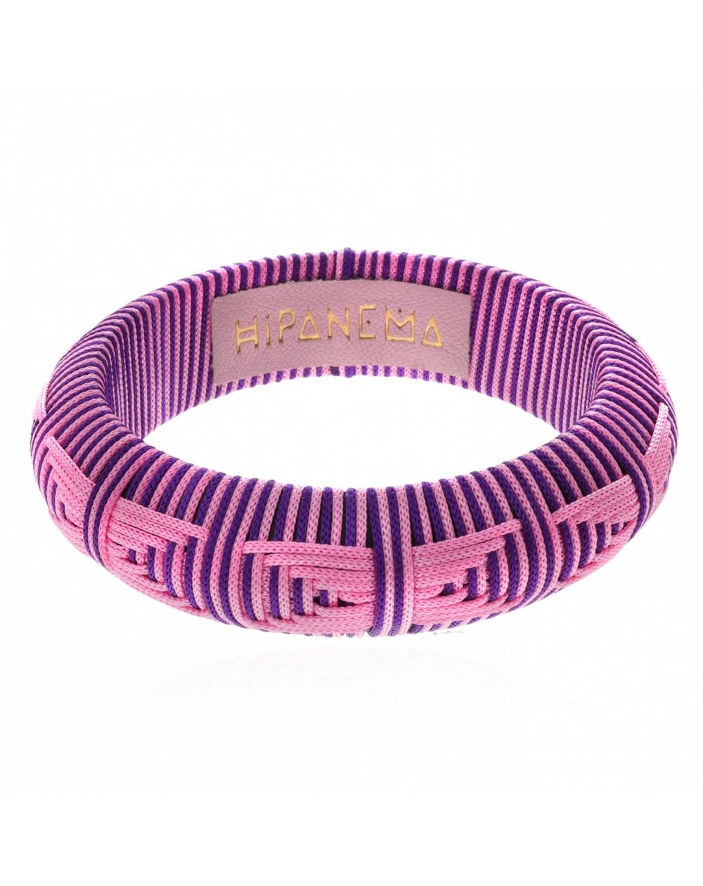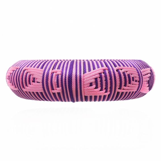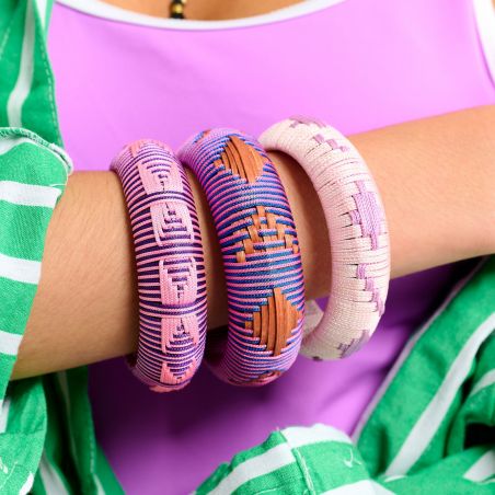 De royaal afgeronde basis zorgt voor een gestructureerd en comfortabel silhouet om de pols. Deze volledig handgeweven roze armband voor dames combineert paarse en roze draden tot dynamische en moderne grafische patronen.