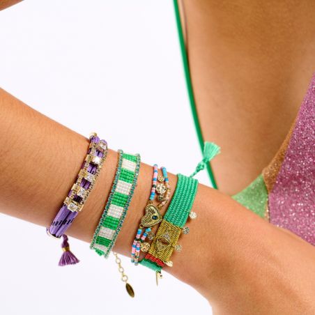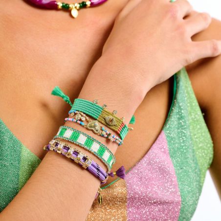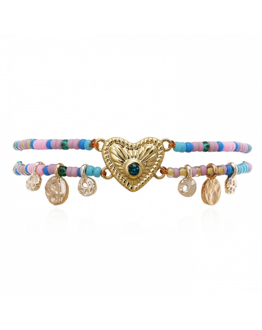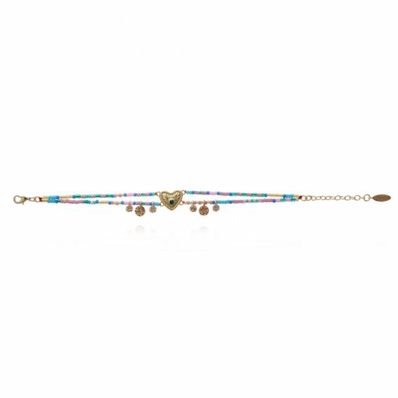 In het midden springt een prachtig vormgegeven hartvormig bedeltje, verguld met 14-karaats goud, direct in het oog. Een sprankelende turquoise strass-steen accentueert het silhouet, terwijl aan weerszijden twee strengen kleurrijke kraaltjes uitsteken. Delicate decoratieve elementen voegen ritme toe aan het ontwerp en versterken de bohemian chique stijl.