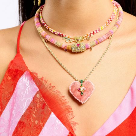 Het geweven patroon van kleurrijke buisvormige kralen creëert een textuurrijke en levendige basis. In het midden onthult een 14-karaats vergulde hanger een roze hartje met toermalijneffect , subtiel omringd door bloemen bezet met strass-steentjes met diamanteffect. Dit centrale motief voegt sprankeling, diepte en vrouwelijkheid toe.